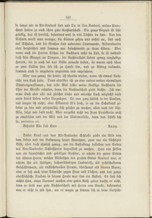 so lange wir in Alt-Neudorf sind und Du in Neu-Neudorf, unsere Papa- chens halten ja auch schon gute Nachbarschaft. Die ganze'Gegend ist sehr gesellig, das ist herrlich, besonders weil so viel Töchter da sind. Von den Söhnen merkt man weniger, die Kleinen gehen uns nichts an, sind auch aus Schulen, und die Großen sind anderswo Lieutenants, Referendarien oder dergleichen und kommen nur besuchsweise zu ihren Eltern. Aber wenn auch die Herren Söhne der Nachbarn nicht da sind, so ist deshalb doch kein Mangel an Tänzern, die Nachbarstadt liefert genug tanzlustige Herren, die ja auch bei uns Visite gemacht haben, sie waren auch schon zu zwei Bällen hier seit ich zu Hause bin, und zu Mittag vielmals, kommen auch so ungebeten angeritten und angefahren.