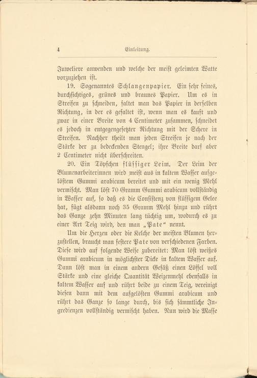 Um die Herzen oder die Kelche der meisten Blumen herzustellen, braucht man festere Pate von verschiedenen Farben. Diese wird auf folgende Weise zubereitet: Man löst weißes Gummi arabicum in möglichster Dicke in kaltem Wasser auf. Dann löst man in einem andern Gefäß einen Löffel voll Stärke und eine gleiche Quantität Weizenmehl ebenfalls in kaltein Wasser auf und rührt beide zu einem Teig, vereinigt diesen dann mit dem aufgelösten Gummi arabicum und rührt das Ganze so lange durch, bis sich sämmtliche Ingredienzen vollständig vermischt haben. Nun wird die Masse