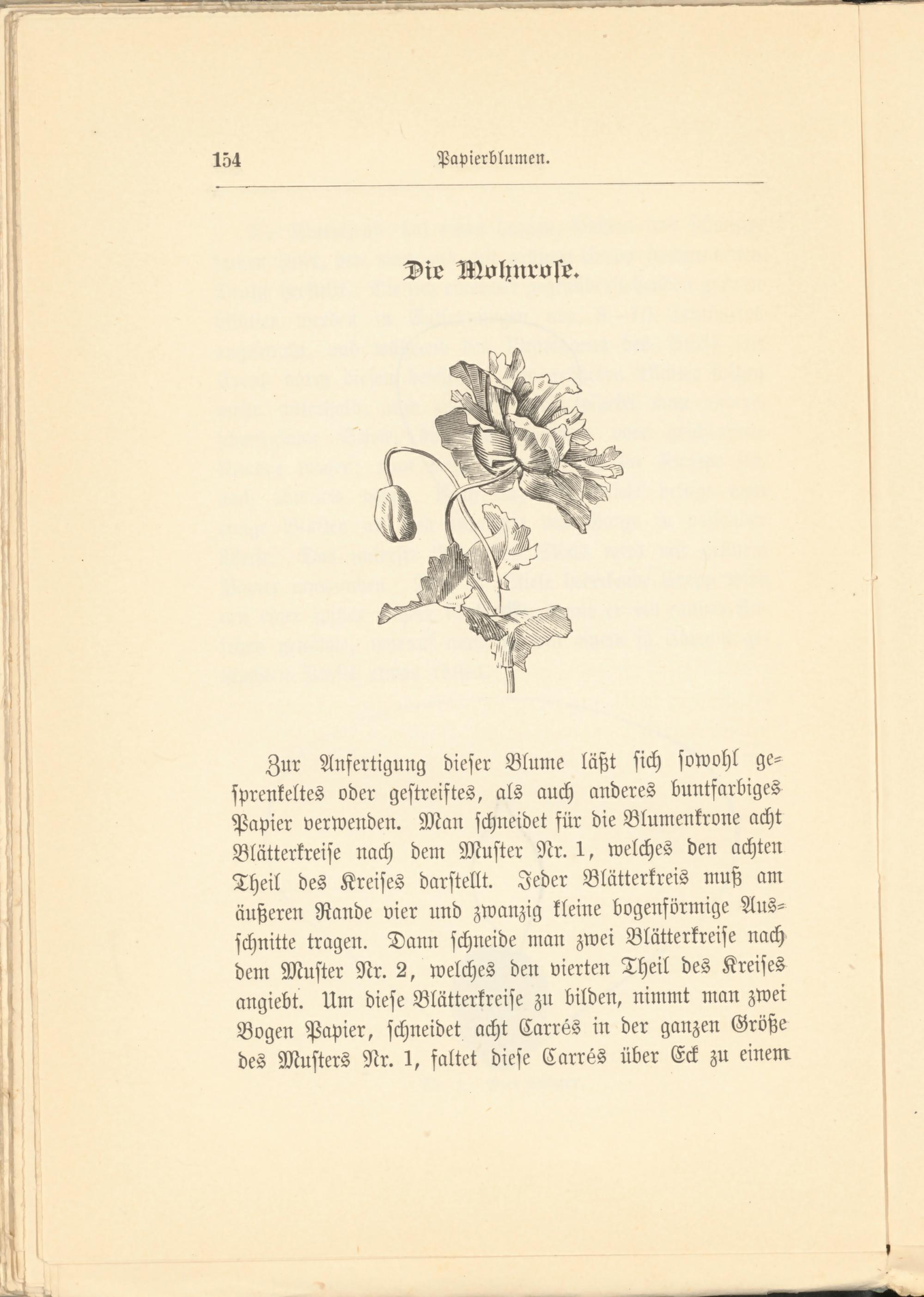 Zur Anfertigung dieser Blume läßt sich sowohl gesprenkeltes oder gestreiftes, als auch anderes buntfarbiges Papier verwenden. Man schneidet für die Blumenkrone acht Blätterkreise nach dem Muster Nr. 1, welches den achten Theil des Kreises darstellt. Jeder Blätterkreis muß am äußeren Rande vier und zwanzig kleine bogenförmige Aus- schnitte tragen. Dann schneide man zwei Blätterkreise nach dem Muster Nr. 2, welches den vierten Theil des Kreises angiebt. Um diese Blätterkreise zu bilden, nimmt man zwei Bogen Papier, schneidet acht Carrss in der ganzen Größe des Musters Nr. 1, faltet diese Carres über Eck zu einem