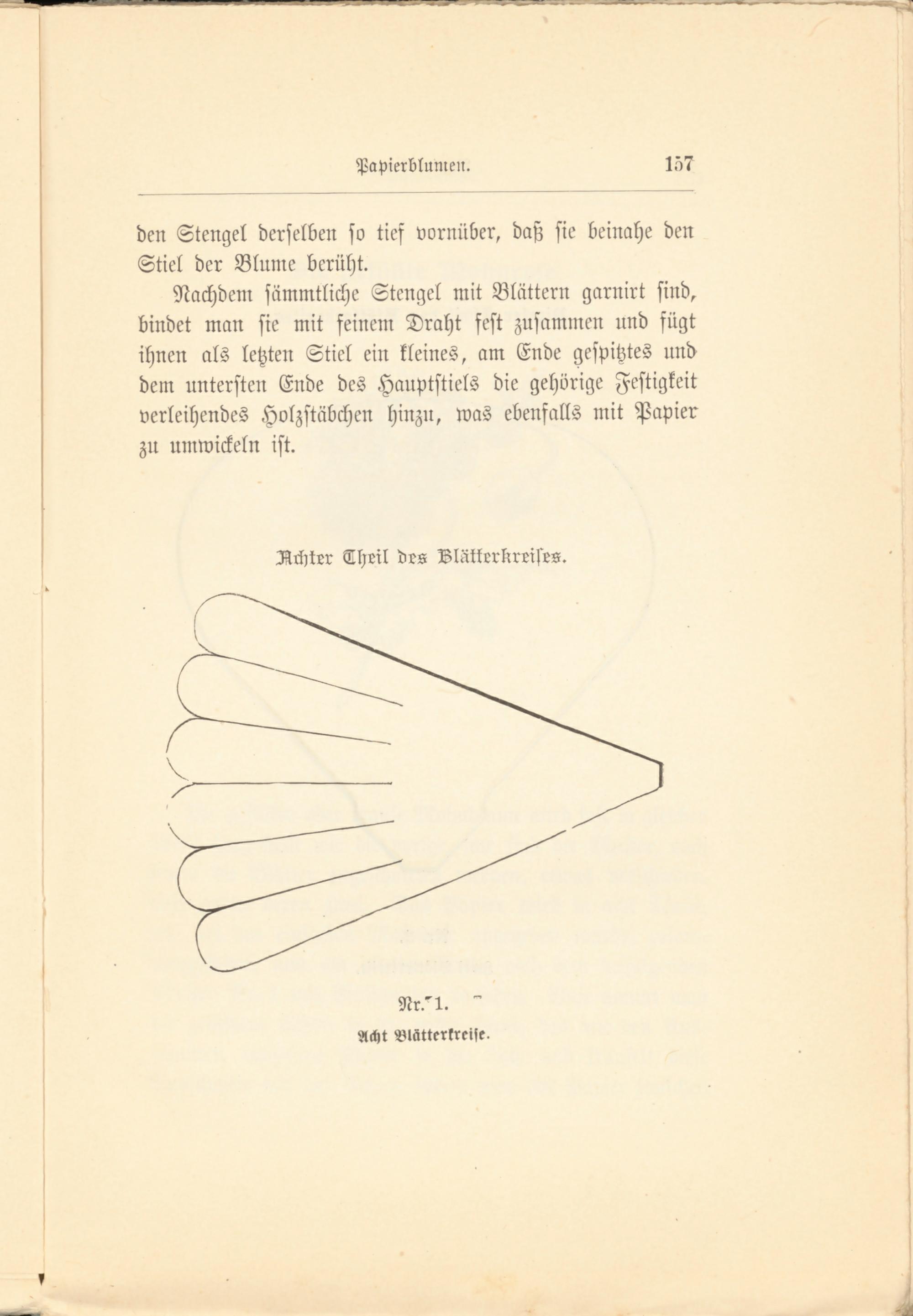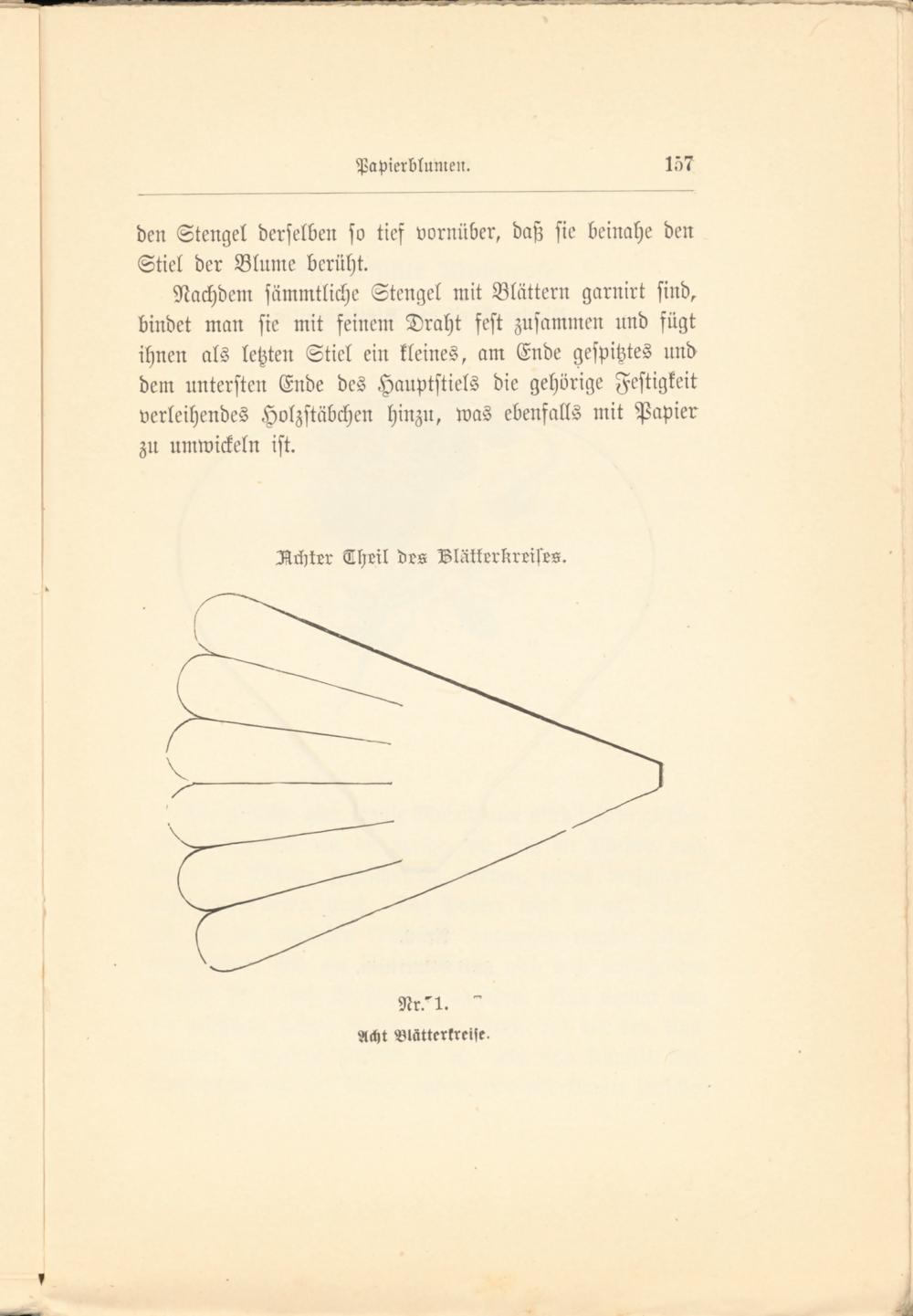Nachdem sämmtliche Stengel mit Blättern garnirt sind, bindet man sie mit feinem Draht fest zusammen und fügt ihnen als letzten Stiel ein kleines, am Ende gespitztes und dem untersten Ende des Hauptstiels die gehörige Festigkeit verleihendes Holzstäbchen hinzu, was ebenfalls mit Papier zu umwickeln ist.