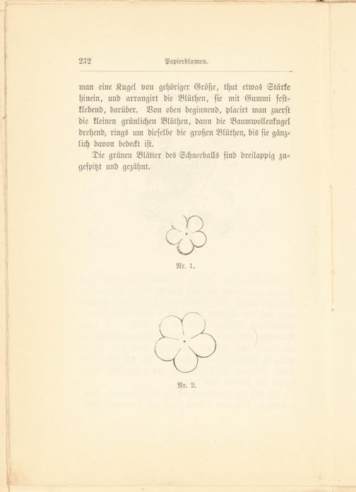 man eine Kugel von gehöriger Größe, thut etwas Stärke hinein, und arrangirt die Blüthen, sie mit Gummi festklebend, darüber. Von oben beginnend, placirt man zuerst die kleinen grünlichen Blüthen, dann die Baumwollenkugel drehend, rings um dieselbe die großen Blüthen, bis sie gänzlich davon bedeckt ist.