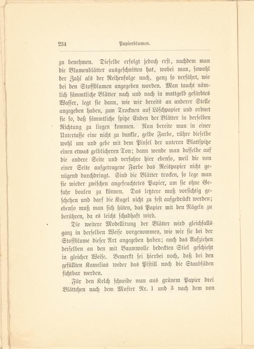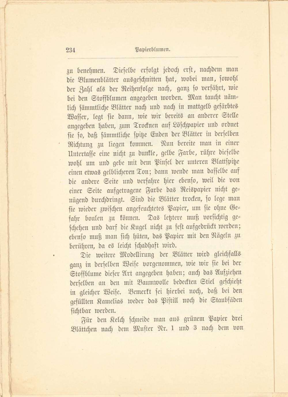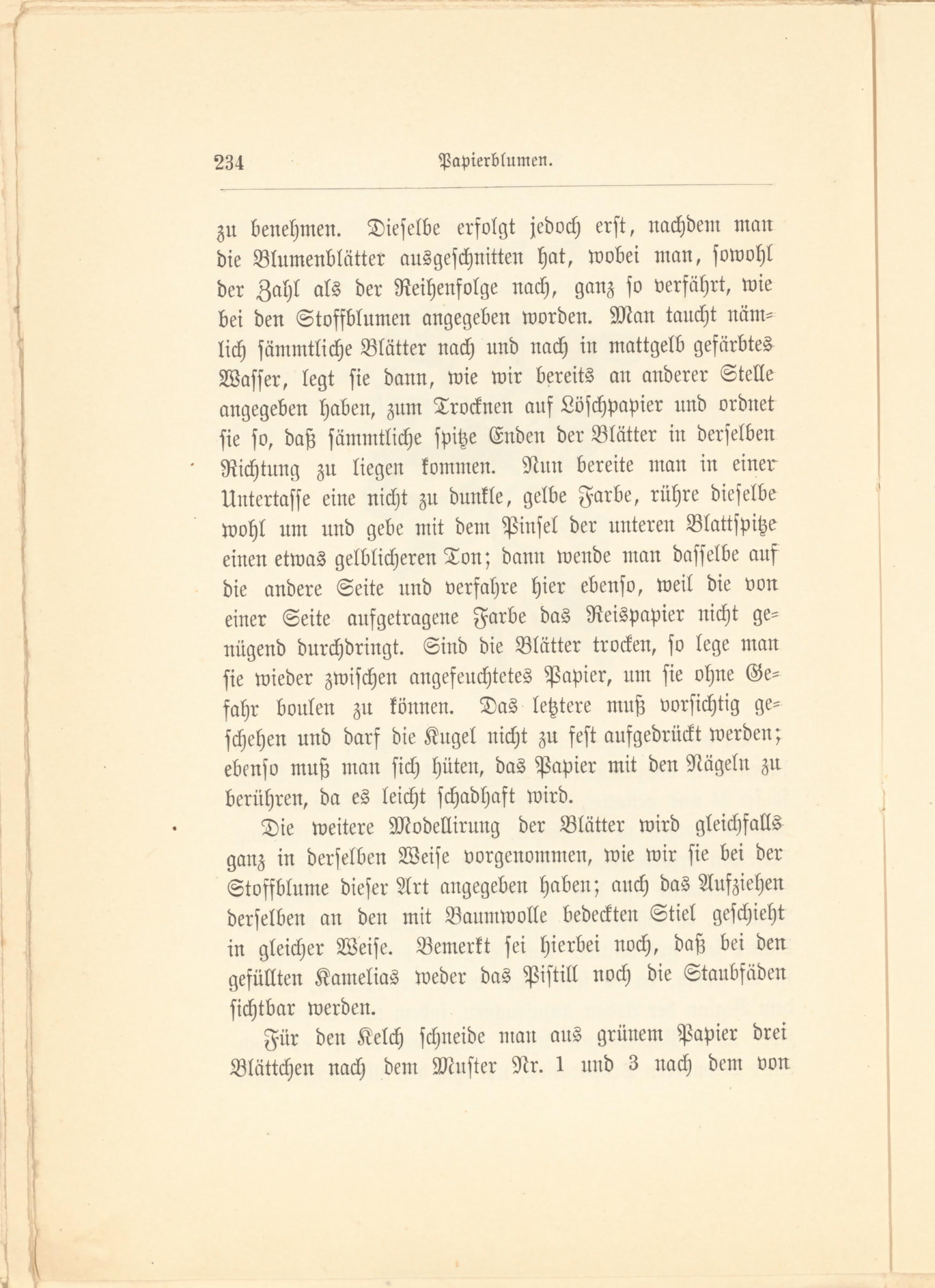 zu benehmen. Dieselbe erfolgt jedoch erst, nachdem man die Blumenblätter ausgeschnitten hat, wobei man, sowohl der Zahl als der Reihenfolge nach, ganz so verfährt, wie bei den Stoffblumen angegeben worden. Man taucht nämlich sämmtliche Blätter nach und nach in mattgelb gefärbtes Wasser, legt sie dann, wie wir bereits an anderer Stelle angegeben haben, zum Trocknen auf Löschpapier und ordnet sie so, daß sämmtliche spitze Enden der Blätter in derselben Richtung zu liegen kommen. Nun bereite man in einer Untertasse eine nicht zu dunkle, gelbe Farbe, rühre dieselbe wohl um und gebe mit dem Pinsel der unteren Blattspitze einen etwas gelblicheren Ton; dann wende man dasselbe auf die andere Seite und verfahre hier ebenso, weil die von einer Seite aufgetragene Farbe das Reispapier nicht genügend durchdrängt. Sind die Blätter trocken, so lege man sie wieder zwischen angefeuchtetes Papier, um sie ohne Gefahr bonlen zu können. Das letztere muß vorsichtig geschehen und darf die Kugel nicht zu fest aufgedrückt werden; ebenso muß man sich hüten, das Papier mit den Nägeln zu berühren, da es leicht schadhaft wird.