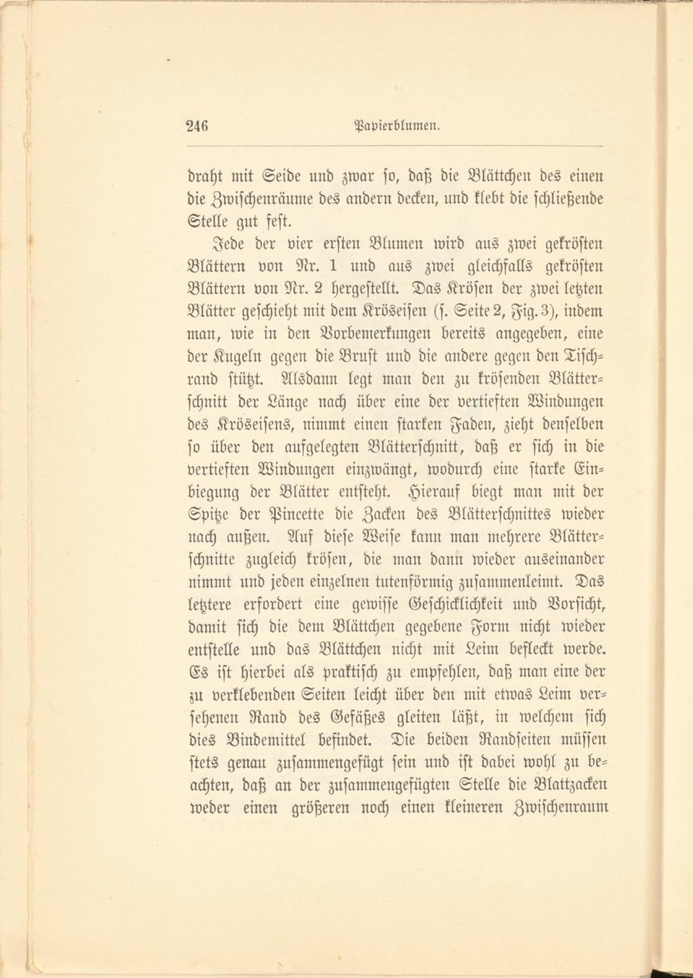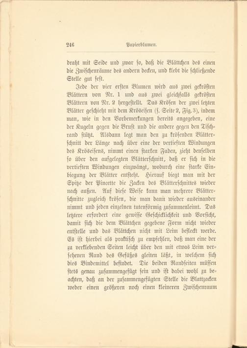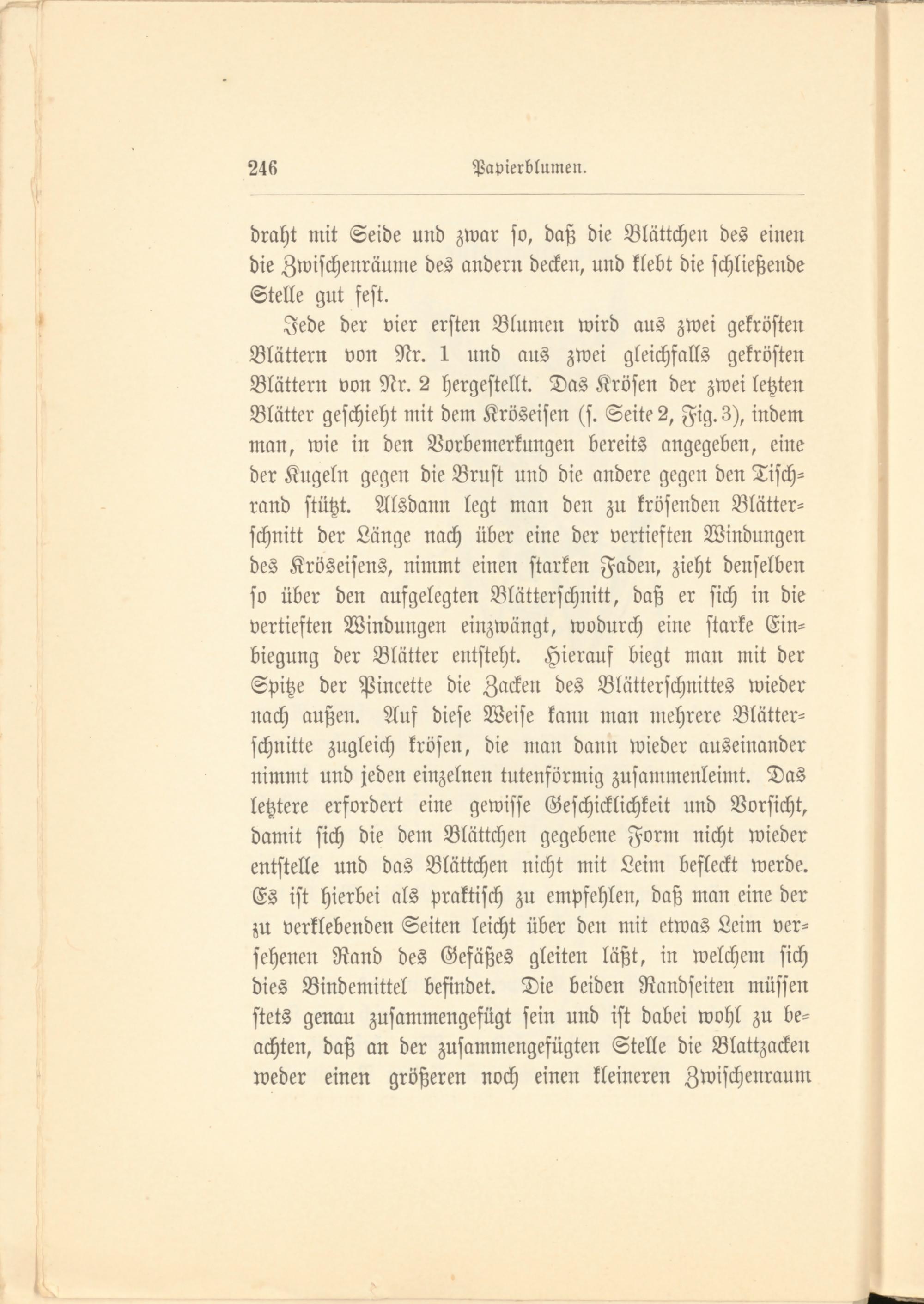 Jede der vier ersten Blumen wird aus zwei gekrösten Blättern von Nr. 1 und aus zwei gleichfalls gekrösten Blättern von Nr. 2 hergestellt. Das Krösen der zwei letzten Blätter geschieht mit dem Kröseisen (s. Seite 2, Fig. 3), indem man, wie in den Vorbemerkungen bereits angegeben, eine der Kugeln gegen die Brust und die andere gegen den Tischrand stützt. Alsdann legt man den zu krösenden Blätterschnitt der Länge nach über eine der vertieften Windungen des Kröseisens, nimmt einen starken Faden, zieht denselben so über den aufgelegten Blätterschnitt, daß er sich in die vertieften Windungen einzwängt, wodurch eine starke Einbiegung der Blätter entsteht. Hierauf biegt man mit der Spitze der Pincette die Zacken des Blätterschnittes wieder nach außen. Auf diese Weise kann man mehrere Blätterschnitte zugleich krösen, die man dann wieder auseinander nimmt und jeden einzelnen tutenförmig zusammenleimt. Das letztere erfordert eine gewisse Geschicklichkeit und Vorsicht, damit sich die dem Blättchen gegebene Form nicht wieder entstelle und das Blättchen nicht mit Leim befleckt werde. Es ist hierbei als praktisch zu empfehlen, daß man eine der zu verklebenden Seiten leicht über den mit etwas Leim versehenen Rand des Gefäßes gleiten läßt, in welchem sich dies Bindemittel befindet. Die beiden Randseiten müssen stets genau zusammengefügt sein und ist dabei wohl zu beachten, daß an der zusammengefügten Stelle die Blattzacken weder einen größeren noch einen kleineren Zwischenraum