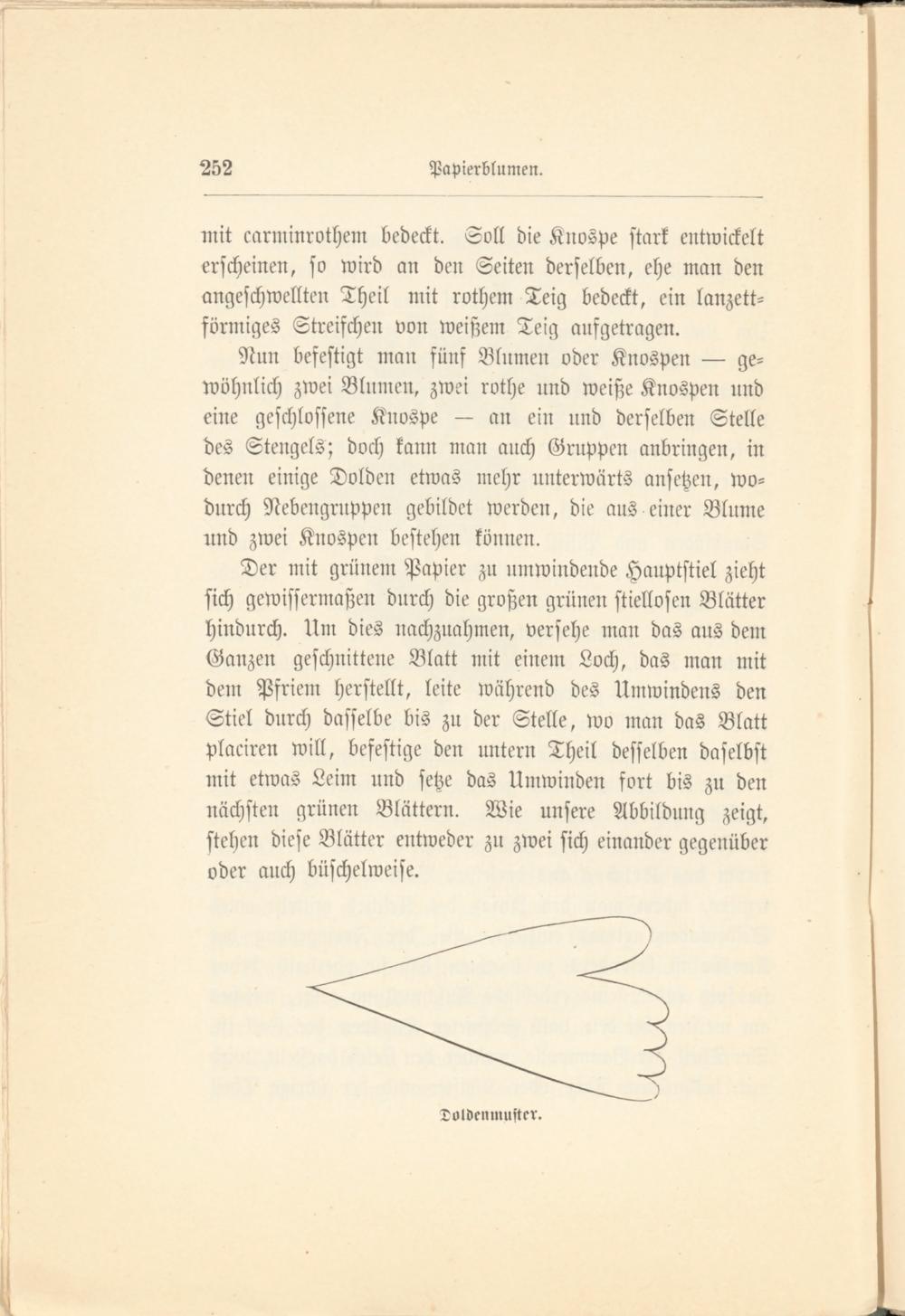 Der mit grünem Papier zu umwindende Hauptstiel zieht sich gewissermaßen durch die großen grünen stiellosen Blätter hindurch. Um dies nachzuahmen, versehe man das aus dem Ganzen geschnittene Blatt mit einem Loch, das man mit dem Pfriem herstellt, leite während des Umwindens den Stiel durch dasselbe bis zu der Stelle, wo man das Blatt placiren will, befestige den untern Theil desselben daselbst mit etwas Leim und setze das Umwinden fort bis zu den nächsten grünen Blättern. Wie unsere Abbildung zeigt, stehen diese Blätter entweder zu zwei sich einander gegenüber oder auch büschelweise.