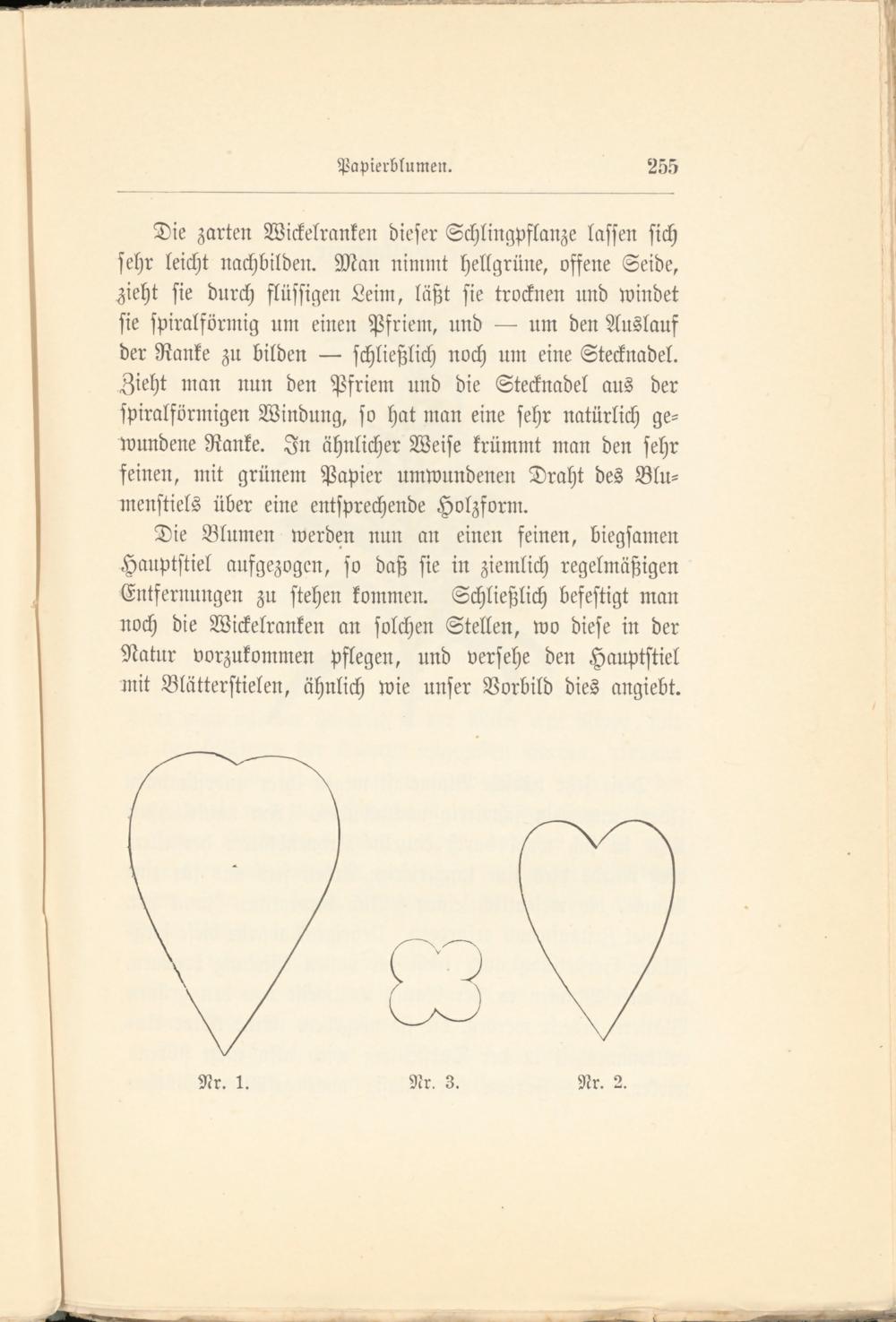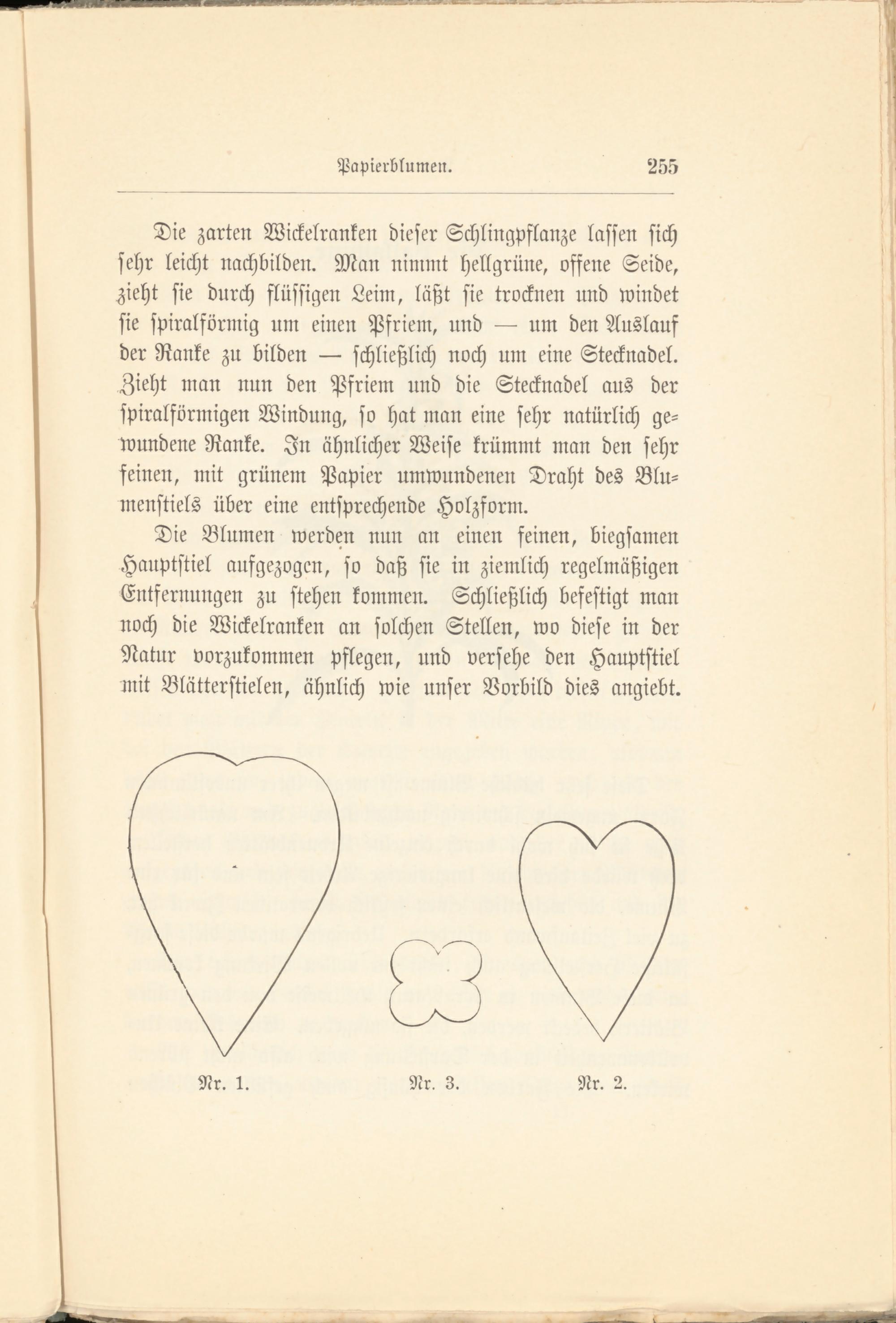 Die zarten Wickelranken dieser Schlingpflanze lassen sich sehr leicht nachbilden. Man nimmt hellgrüne, offene Seide, zieht sie durch flüssigen Leim, läßt sie trocknen und windet sie spiralförmig nur einen Pfriem, und — um den Auslauf der Ranke zu bilden — schließlich noch um eine Stecknadel. Zieht man nun den Pfriem und die Stecknadel aus der spiralförmigen Windung, so hat man eine sehr natürlich gewundene Ranke. In ähnlicher Weise krümmt man den sehr feinen, mit grünem Papier umwundenen Draht des Blumenstiels über eine entsprechende Holzform.