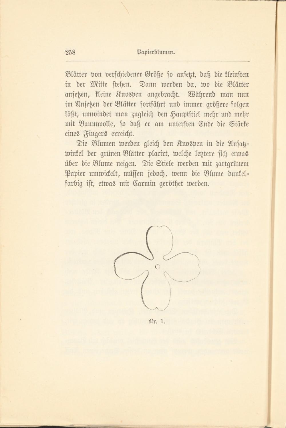 Die Blumen werden gleich den Knospen in die Ansatzwinkel der grünen Blätter placirt, welche letztere sich etwas über die Blume neigen. Die Stiele werden mit zartgrünem Papier umwickelt, müssen jedoch, wenn die Blume dunkelfarbig ist, etwas mit Carmin geröthet werden.