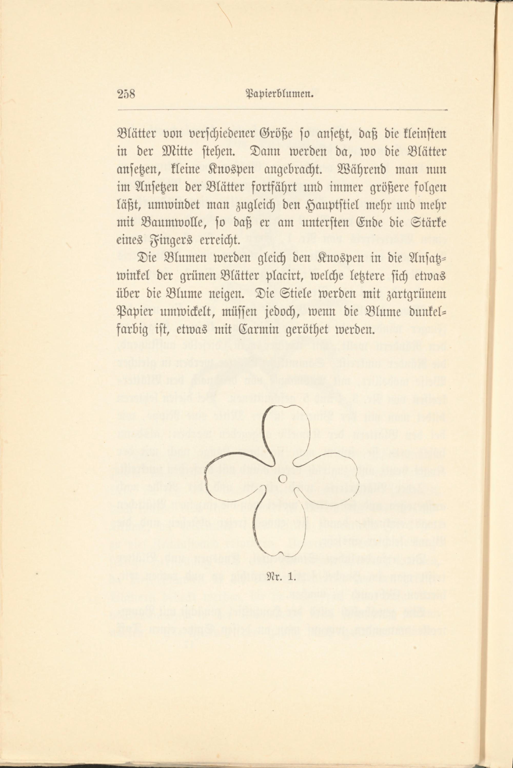 Blätter von verschiedener Größe so ansetzt, daß die kleinsten in der Mitte stehen. Dann werden da, wo die Blätter ansetzen, kleine Knospen angebracht. Während man nun im Ansetzen der Blätter fortfährt und immer größere folgen läßt, umwindet man zugleich den Hauptstiel mehr und mehr mit Baumwolle, so daß er am untersten Ende die Stärke eines Fingers erreicht.