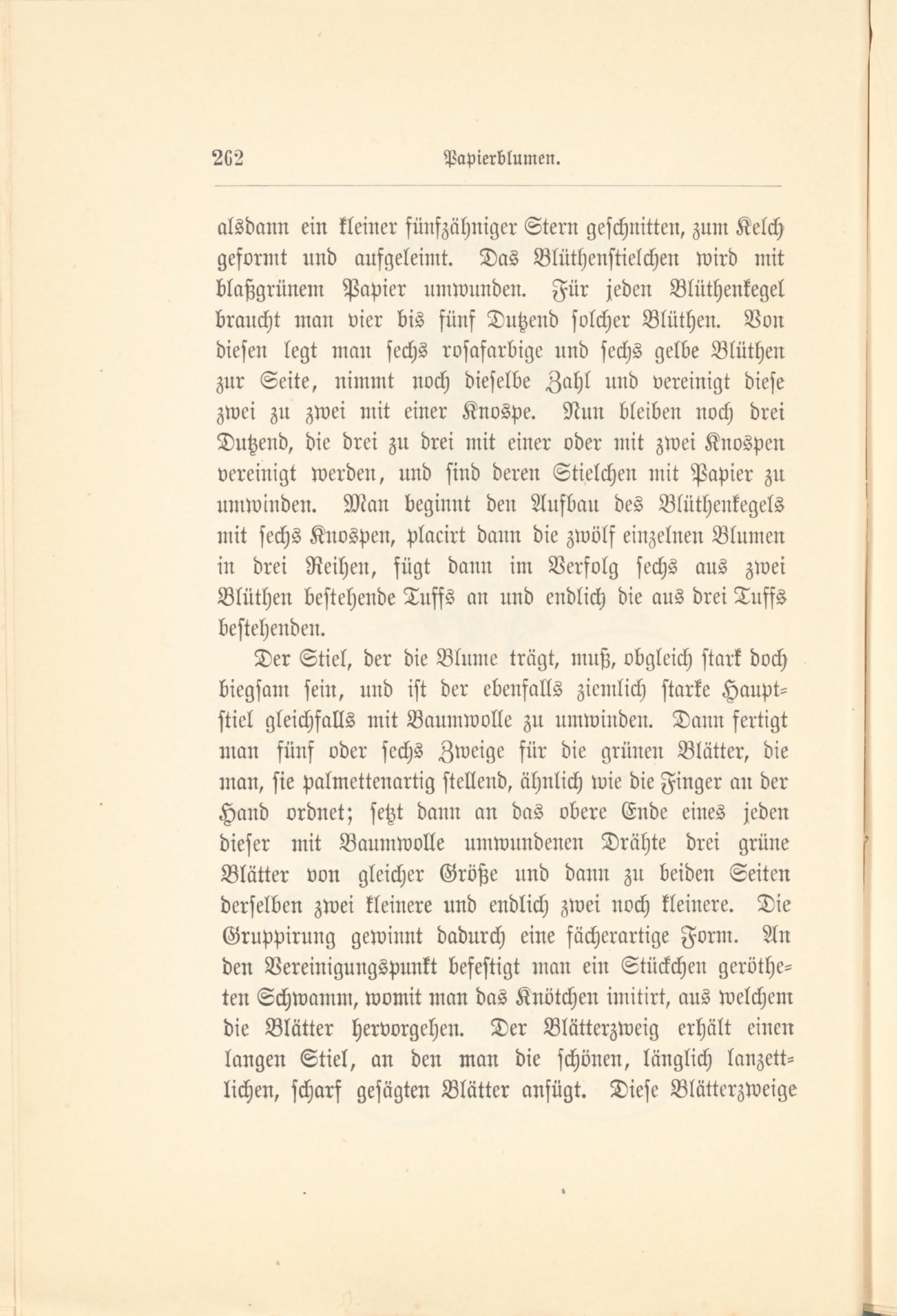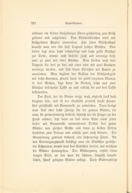 alsdann ein kleiner fünfzähniger Stern geschnitten, zum Kelch geformt und aufgeleimt. Das Blüthenstielchen wird mit blaßgrünem Papier umwunden. Für jeden Blüthenkegel braucht man vier bis fünf Dutzend solcher Blüthen. Von diesen legt man sechs rosafarbige und sechs gelbe Blüthen zur Seite, nimmt noch dieselbe Zahl und vereinigt diese zwei zu zwei mit einer Knospe. Nun bleiben noch drei Dutzend, die drei zu drei mit einer oder mit zwei Knospen vereinigt werden, und sind deren Stielchen mit Papier zu umwinden. Man beginnt den Aufbau des Blüthenkegels mit sechs Knospen, placirt dann die zwölf einzelnen Blumen in drei Reihen, fügt dann im Verfolg sechs aus zwei Blüthen bestehende Tuffs an und endlich die aus drei Tuffs bestehenden.