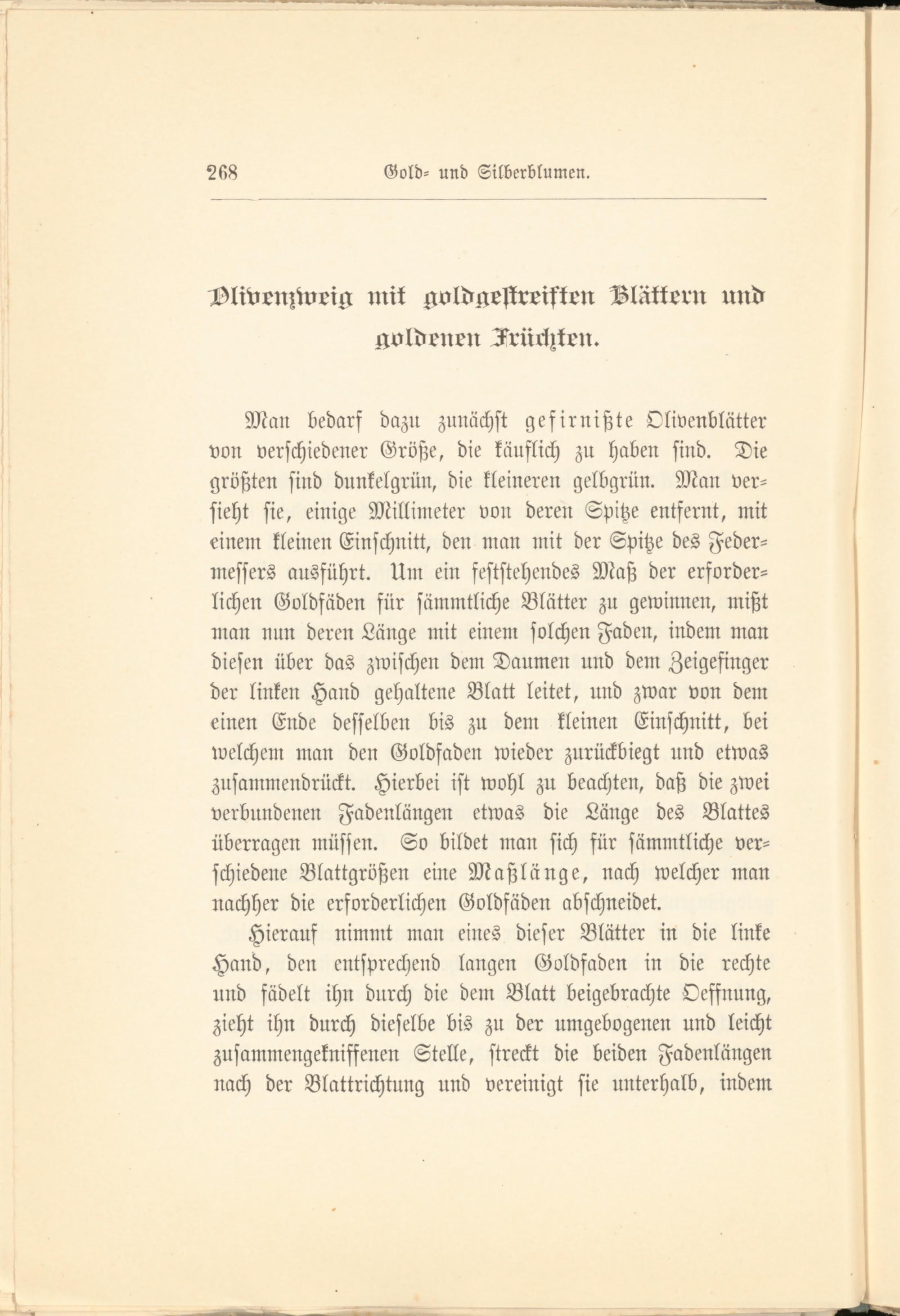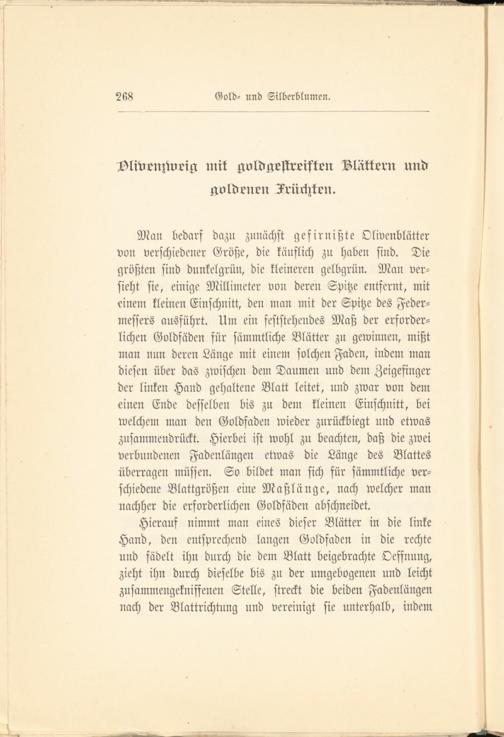 Man bedarf dazu zunächst gefirnißte Olivenblätter von verschiedener Größe, die käuflich zu haben sind. Die größten sind dunkelgrün, die kleineren gelbgrün. Alan versieht sie, einige Millimeter von deren Spitze entfernt, mit einem kleinen Einschnitt, den man mit der Spitze des Federmessers ausführt. Um ein feststehendes Maß der erforderlichen Goldfäden für sämmtliche Blätter zu gewinnen, mißt man nun deren Länge mit einem solchen Faden, indem man diesen über das zwischen dem Daumen und dem Zeigefinger der linken Hand gehaltene Blatt leitet, und zwar von dem einen Ende desselben bis zu dem kleinen Einschnitt, bei welchem man den Goldfaden wieder zurückbiegt und etwas zusammendrückt. Hierbei ist wohl zu beachten, daß die zwei verbundenen Fadenlängen etwas die Länge des Blattes überragen müssen. So bildet man sich für sämmtliche verschiedene Blattgrößen eine Maßlänge, nach welcher man nachher die erforderlichen Goldfäden abschneidet.