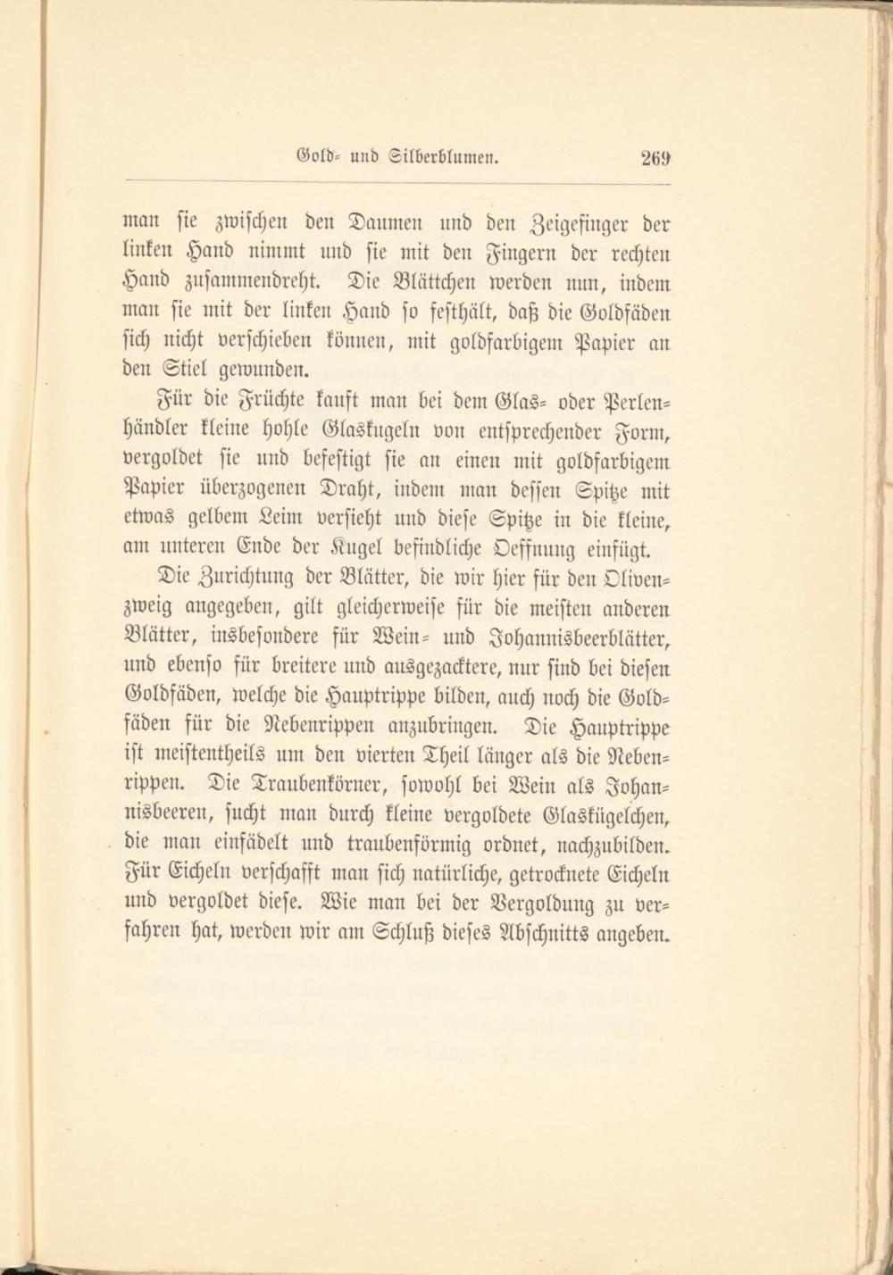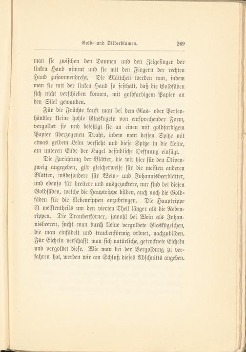 Die Zurichtung der Blätter, die wir hier für den Oliven- zweig angegeben, gilt gleicherweise für die meisten anderen Blätter, insbesondere für Wein- und Johannisbeerblätter, und ebenso für breitere und ausgezacktere, nur sind bei diesen Goldfäden, welche die Hauptrippe bilden, auch noch die Goldfäden für die Nebenrippen anzubringen. Die Hauptrippe ist meistentheils um den vierten Theil länger als die Nebenrippen. Die Traubenkörner, sowohl bei Wein als Johannisbeeren, sucht man durch kleine vergoldete Glaskügelchen, die man einfädelt und traubenförmig ordnet, nachzubilden. Für Eicheln verschafft man sich natürliche, getrocknete Eicheln und vergoldet diese. Wie man bei der Vergoldung zu verfahren hat, werden wir am Schluß dieses Abschnitts angeben.