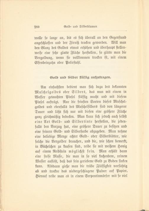 Am einfachsten bedient man sich dazu des bekannten Muschelgoldes oder Silbers, das man mit einem in Wasser getauchten Pinsel flüssig macht und mit diesen: Pinsel aufträgt. Nur die feinsten Sorten dieses Muschelgoldes und ebenfalls des Muschelsilbers sind von längerer Dauer und läßt sich nur mit diesen eine größere Fläche ganz gleichmäßig bedecken. Man kann sich jedoch auch selbst eine Art Gold- und Silbertinte herstellen, die jedenfalls den Vorzug hat, eine größere Dauer zu besitzen und eine feinere Gold- und Silberfarbe abzugeben. Man nehme eine beliebige Menge echter Gold- oder Silberblätter, wie solche die Vergolden brauchen, und die, wie schon bemerkt, in Büchelchen zu kaufen sind, reibe sie mit weißem Honig auf einem Reibftein möglichst fein. Man erhält dann eine steife Masse, die man in so viel kochendem, reinem Wasser auflöst, daß das fein geriebene Gold zu Boden sinken kann. Alsdann gieße man die trübe Flüssigkeit vorsichtig ab und trockne das niedergeschlagene Pulver auf Papier. Hierauf reibe man es in einem Serpentinmörser mit so viel