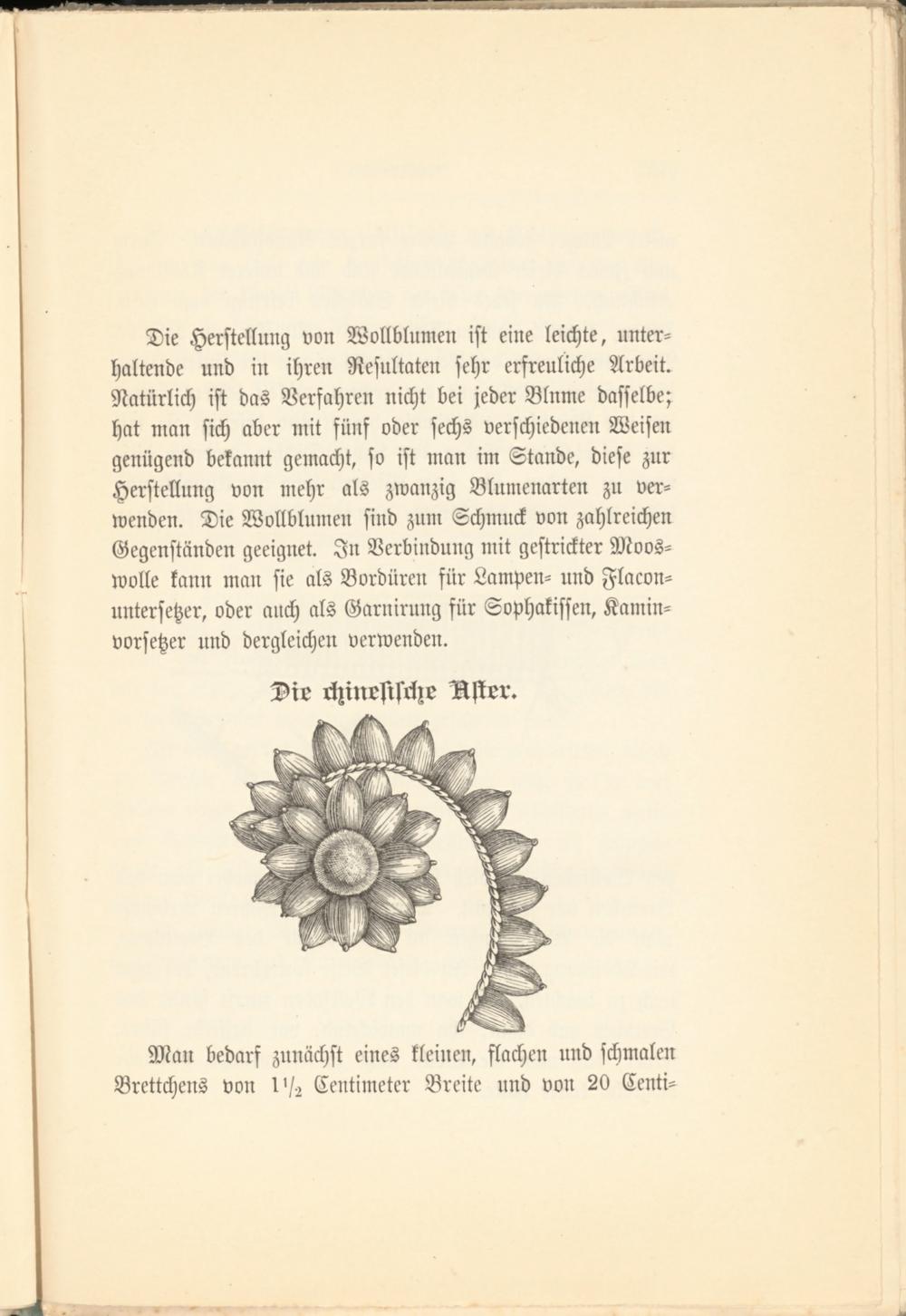Die Herstellung von Wollblumen ist eine leichte, unterhaltende und in ihren Resultaten sehr erfreuliche Arbeit. Natürlich ist das Verfahren nicht bei jeder Blnme dasselbe; hat man sich aber mit fünf oder sechs verschiedenen Weisen genügend bekannt gemacht, so ist man im Stande, diese zur Herstellung von mehr als zwanzig Blumenarten zu verwenden. Die Wollblumen sind zum Schmuck von zahlreichen Gegenständen geeignet. In Verbindung mit gestrickter Mooswolle kann man sie als Bordüren für Lampen- und Flacon- untersetzer, oder auch als Garnirnng für Sophakissen, Kamin- vorsetzer und dergleichen verwenden.