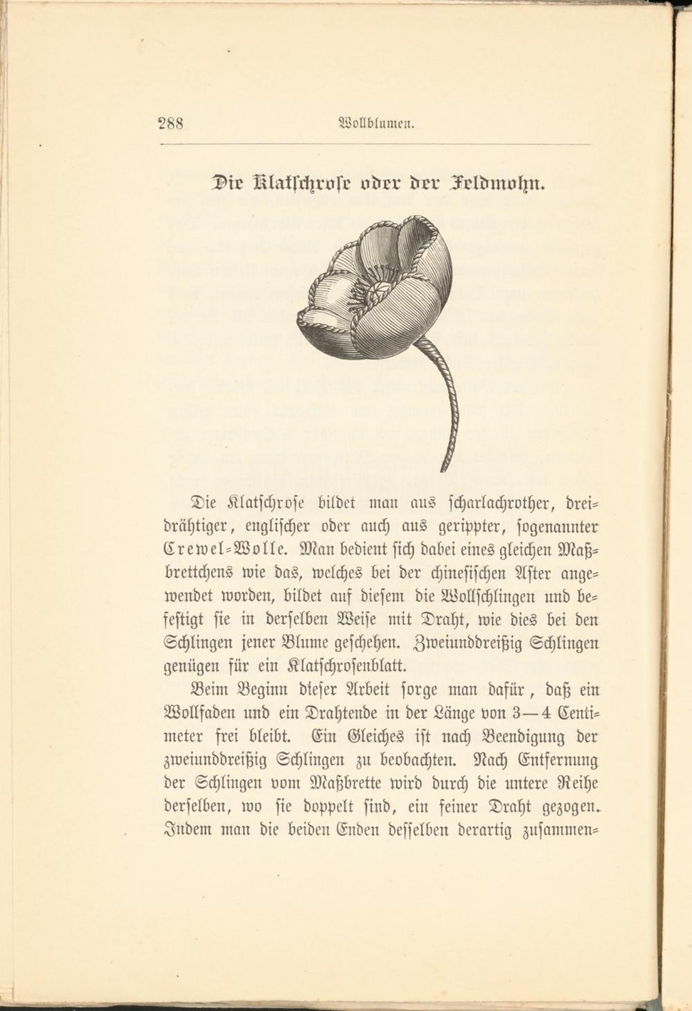 Die Klatschrose bildet man aus scharlachrother, drei- drähtiger, englischer oder auch aus gerippter, sogenannter Crewel-Wolle. Man bedient sich dabei eines gleichen Maß- brettchens wie das, welches bei der chinesischen Aster angewendet worden, bildet auf diesem die Wollschlingen und befestigt sie in derselben Weise mit Draht, wie dies bei den Schlingen jener Blume geschehen. Zweiunddreißig Schlingen genügen für ein Klatschrosenblatt.