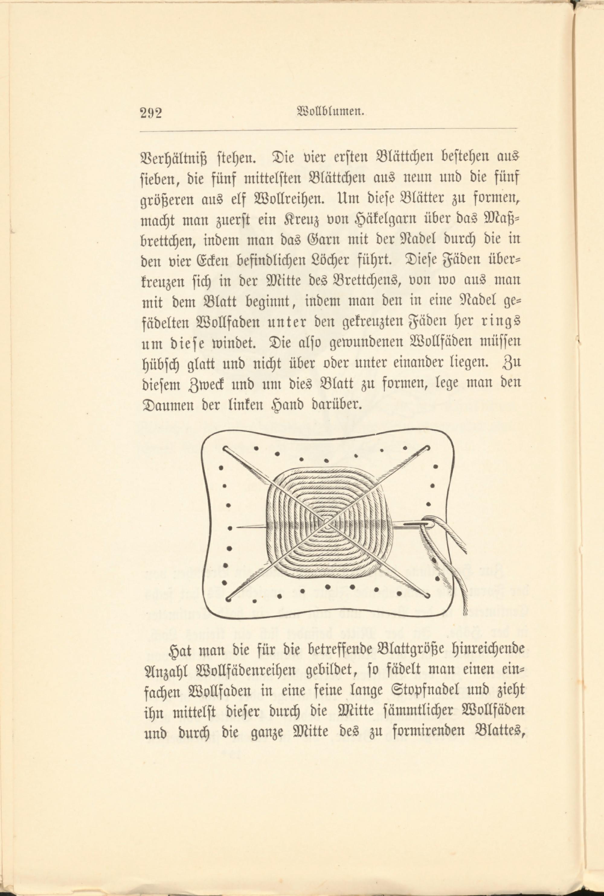 Verhältniß stehen. Die vier ersten Blättchen bestehen aus sieben, die fünf mittelsten Blättchen aus neun und die fünf größeren aus elf Wollreihen. Um diese Blätter zu formen, macht man zuerst ein Kreuz von Häkelgarn über das Maß- brettchen, indem man das Garn mit der Nadel durch die in den vier Ecken befindlichen Löcher führt. Diese Fäden über- kreuzen sich in der Mitte des Brettchens, von wo aus man mit dem Blatt beginnt, indem man den in eine Nadel gefädelten Wollfaden unter den gekreuzten Fäden her rings um diese windet. Die also gewundenen Wollfäden müssen hübsch glatt und nicht über oder unter einander liegen. Zu diesem Zweck und uni dies Blatt zu formen, lege man den Daumen der linken Hand darüber.