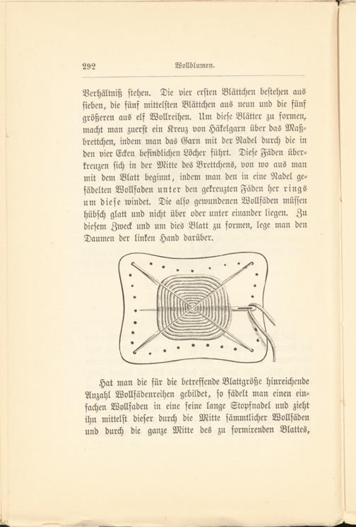 Hat man die für die betreffende Blattgröße hinreichende Anzahl Wollfädenreihen gebildet, so fädelt man einen einfachen Wollfaden in eine feine lange Stopfnadel und zieht ihn mittelst dieser durch die Mitte sämmtlicher Wollfäden und durch die ganze Mitte des zu formirenden Blattes,