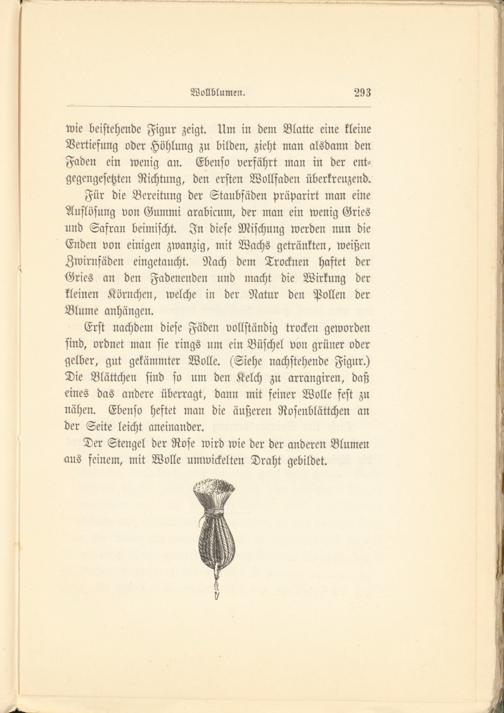 Erst nachdem diese Fäden vollständig trocken geworden sind, ordnet man sie rings um ein Büschel von grüner oder gelber, gut gekämmter Wolle. (Siehe nachstehende Figur.) Die Blättchen sind so um den Kelch zu arrangiren, daß eines das andere überragt, dann mit feiner Wolle fest zu nähen. Ebenso heftet man die äußeren Rosenblüttchen an der Seite leicht aneinander.