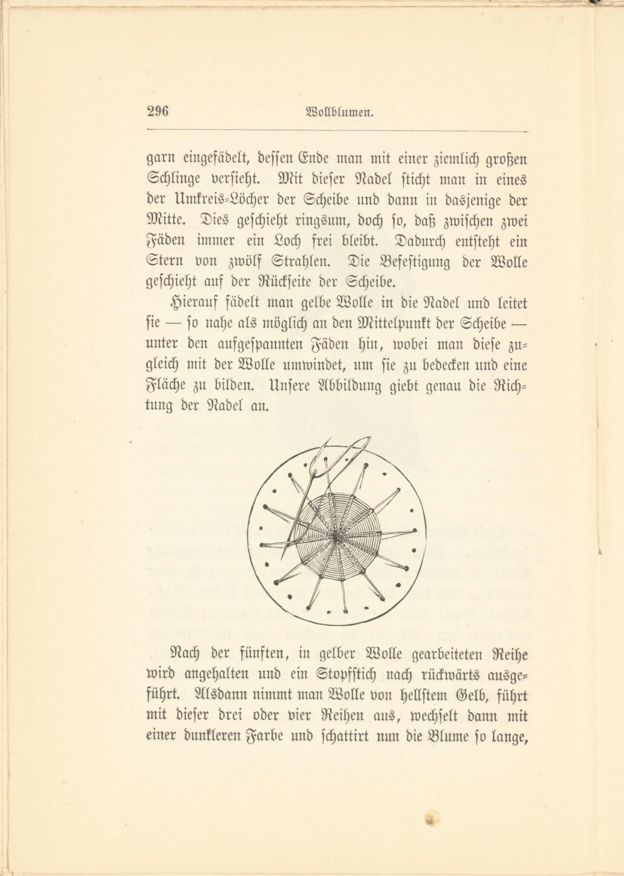 Hierauf fädelt man gelbe Wolle in die Nadel und leitet sie — so nahe als möglich an den Mittelpunkt der Scheibe — unter den aufgespannten Fäden hin, wobei man diese zugleich mit der Wolle umwindet, um sie zu bedecken und eine Fläche zu bilden. Unsere Abbildung giebt genau die Richtung der Nadel an.