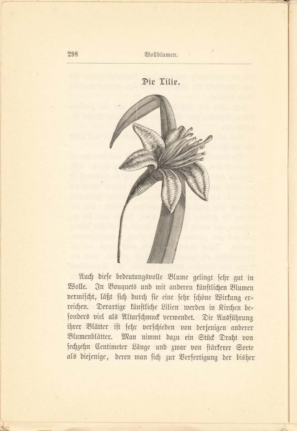 Auch diese bedeutungsvolle Blume gelingt sehr gut in Wolle. In Bouquets und mit anderen künstlichen Blumen vermischt, läßt sich durch sie eine sehr schöne Wirkung erreichen. Derartige künstliche Lilien werden in Kirchen besonders viel als Altarschmuck verwendet. Die Ausführung ihrer Blätter ist sehr verschieden von derjenigen anderer Blumenblätter. Man nimmt dazu ein Stück Draht von sechzehn Centimeter Länge und zwar von stärkerer Sorte als diejenige, deren man sich zur Verfertigung der bisher