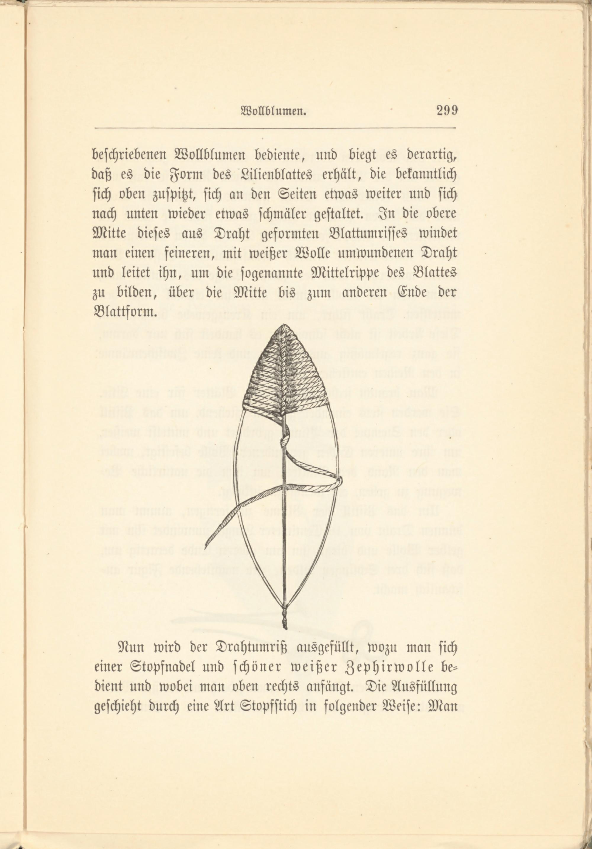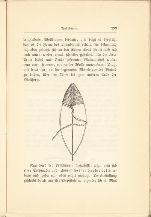 beschriebenen Wollblumen bediente, und biegt es derartig, daß es die Form des Lilienblattes erhält, die bekanntlich sich oben zuspitzt, sich an den Seiten etwas weiter und sich nach unten wieder etwas schmäler gestaltet. In die obere Mitte dieses aus Draht geformten Blattumrisses windet man einen feineren, mit weißer Wolle umwundenen Draht und leitet ihn, um die sogenannte Mittelrippe des Blattes zu bilden, über die Mitte bis zum anderen Ende der Blattform.