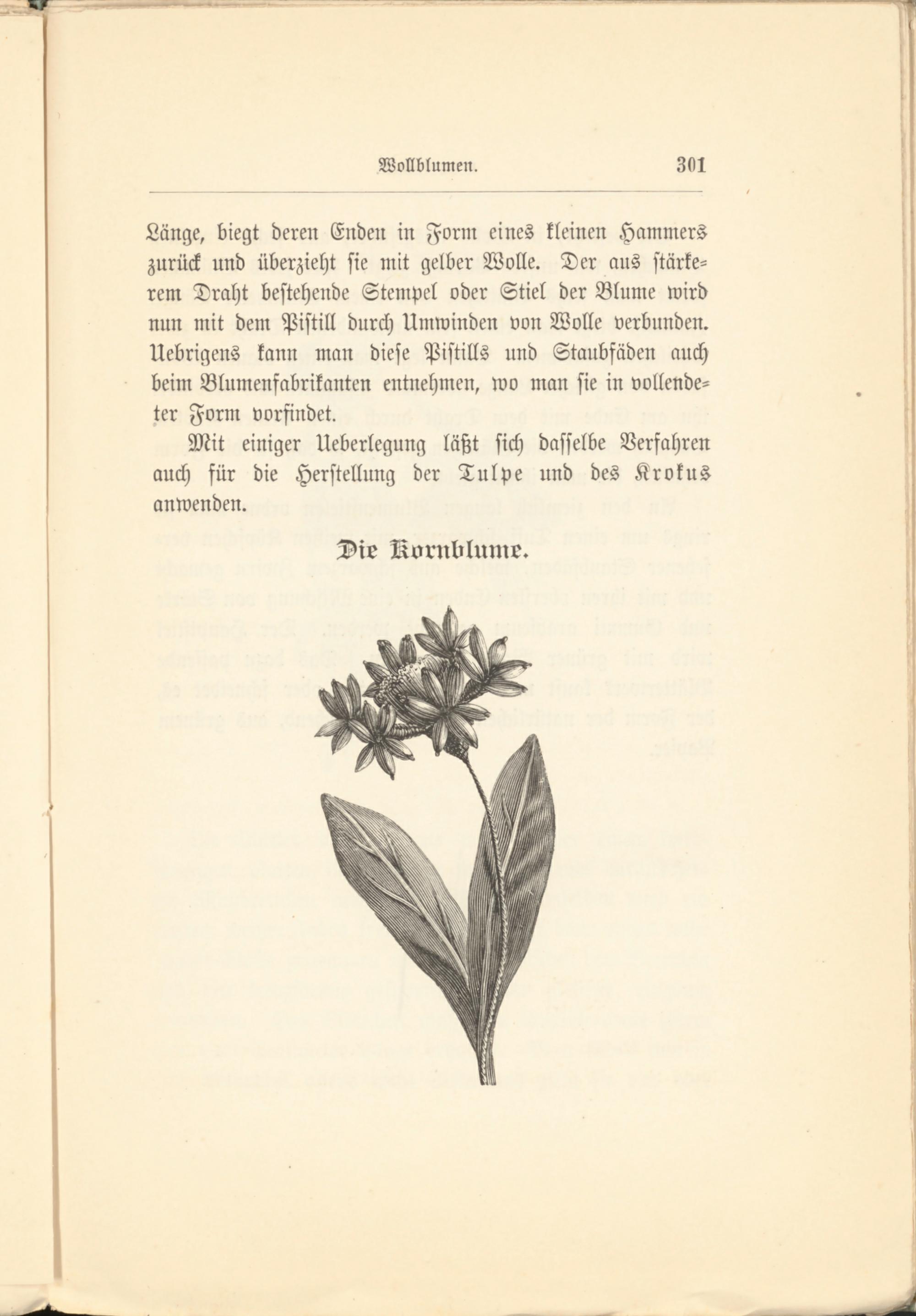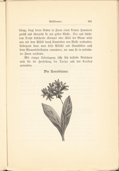 Länge, biegt deren Enden in Form eines kleinen Hammers zurück und überzieht sie mit gelber Wolle. Der aus stärkerem Draht bestehende Stempel oder Stiel der Blume wird nun mit dem Pistill durch Umwinden von Wolle verbunden. Uebrigens kann man diese Pistills und Staubfäden auch beim Blumenfabrikanten entnehmen, wo man sie in vollendeter Form vorfindet.