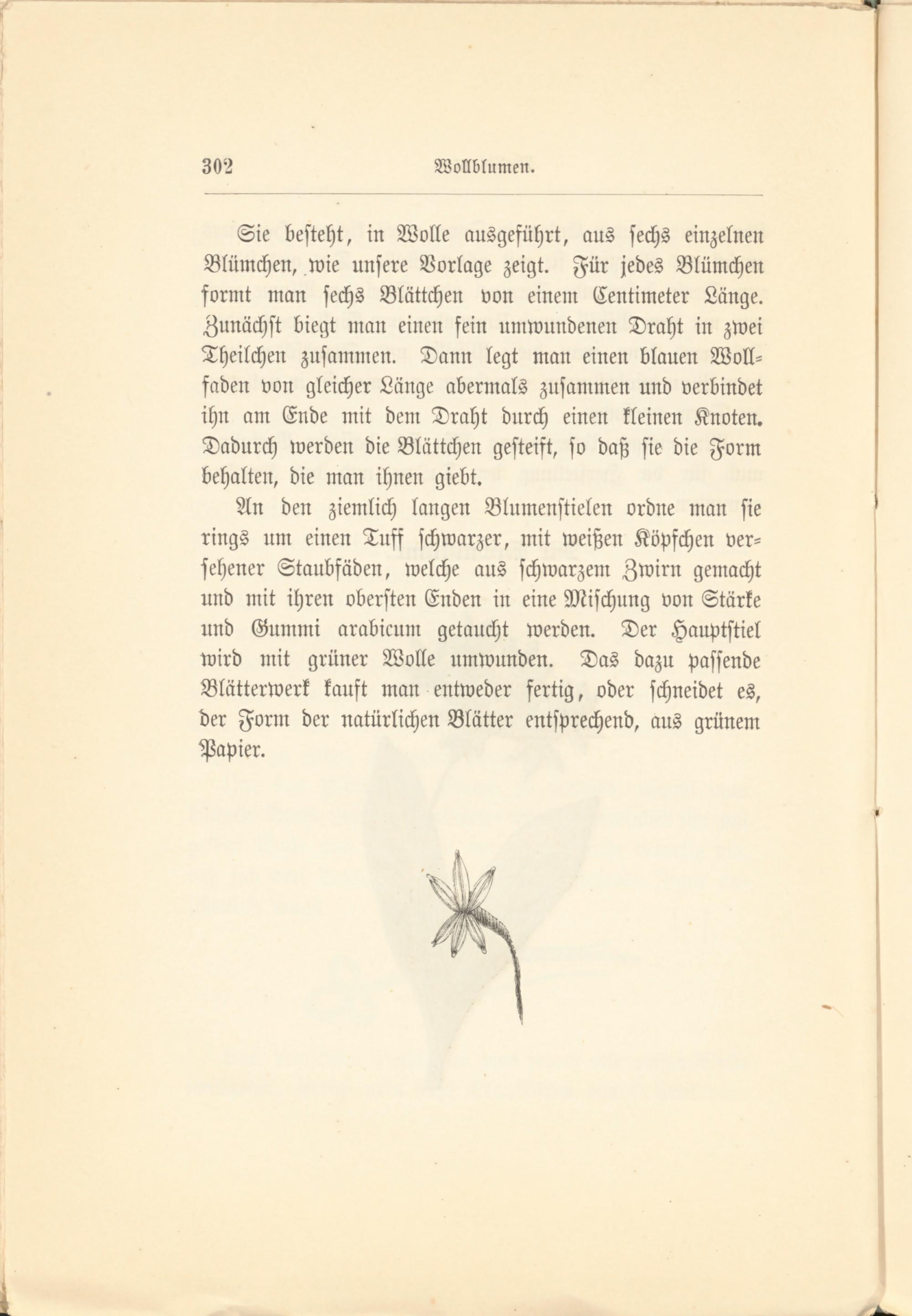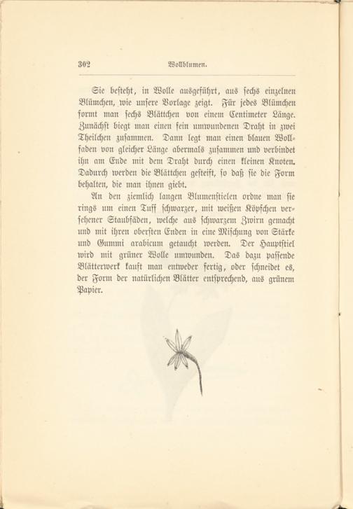 An den ziemlich langen Blumenstielen ordne man sie rings um einen Tuff schwarzer, mit weißen Köpfchen versehener Staubfäden, welche aus schwarzem Zwirn gemacht und mit ihren obersten Enden in eine Mischung von Stärke und Gummi arabicum getaucht werden. Der Hauptstiel wird mit grüner Wolle umwunden. Das dazu passende Blätterwerk kauft man entweder fertig, oder schneidet es, der Form der natürlichen Blätter entsprechend, aus grünem Papier.