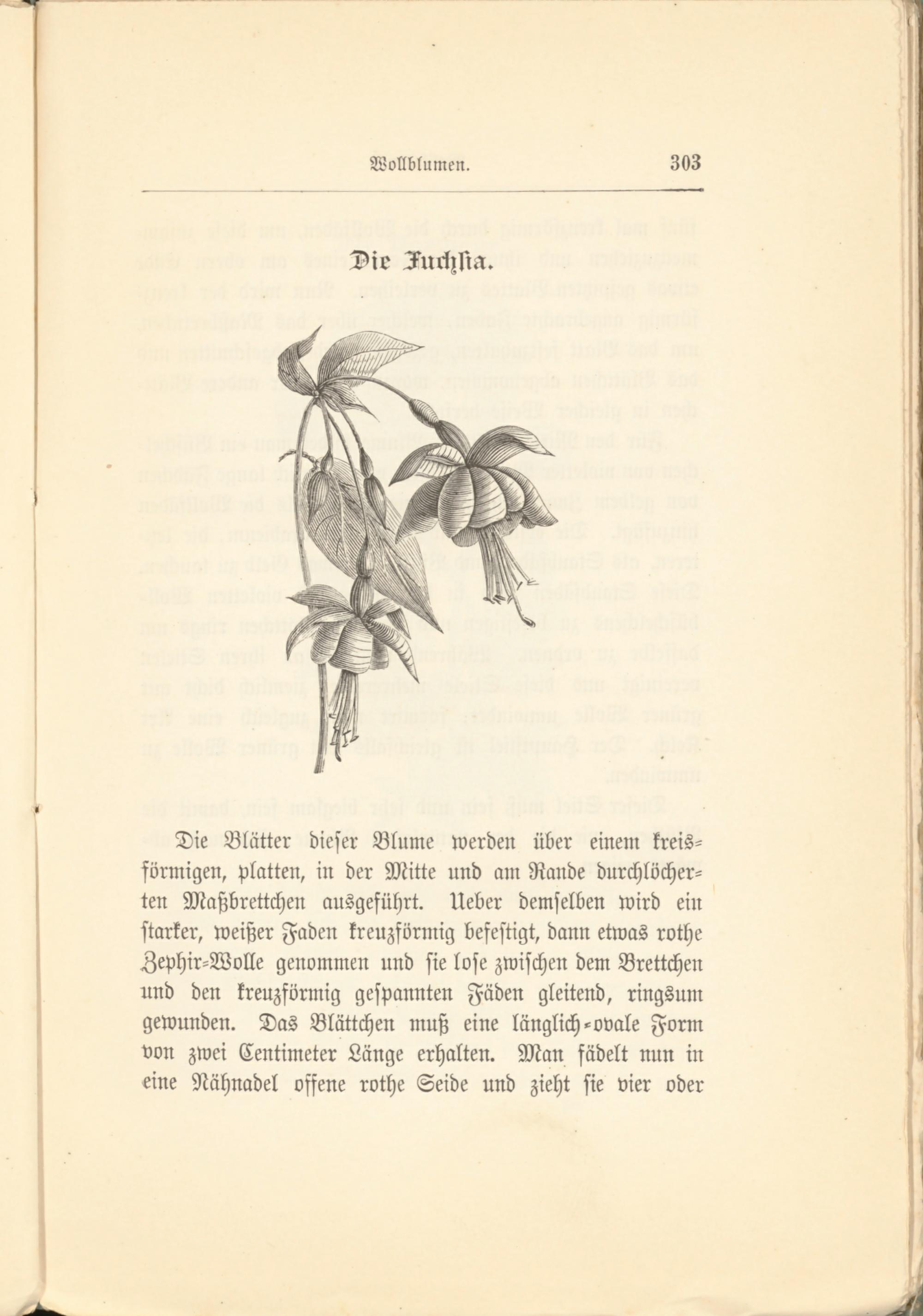 Die Blätter dieser Blume werden über einem kreisförmigen, platten, in der Mitte und am Rande durchlöcherten Maßbrettchen ausgeführt. Ueber demselben wird ein starker, weißer Faden kreuzförmig befestigt, dann etwas rothe Zephir-Wolle genommen und sie lose zwischen dem Brettchen und den kreuzförmig gespannten Fäden gleitend, ringsum gewunden. Das Blättchen muß eine länglich-ovale Form von zwei Centimeter Länge erhalten. Man fädelt nun in eine Nähnadel offene rothe Seide und zieht sie vier oder