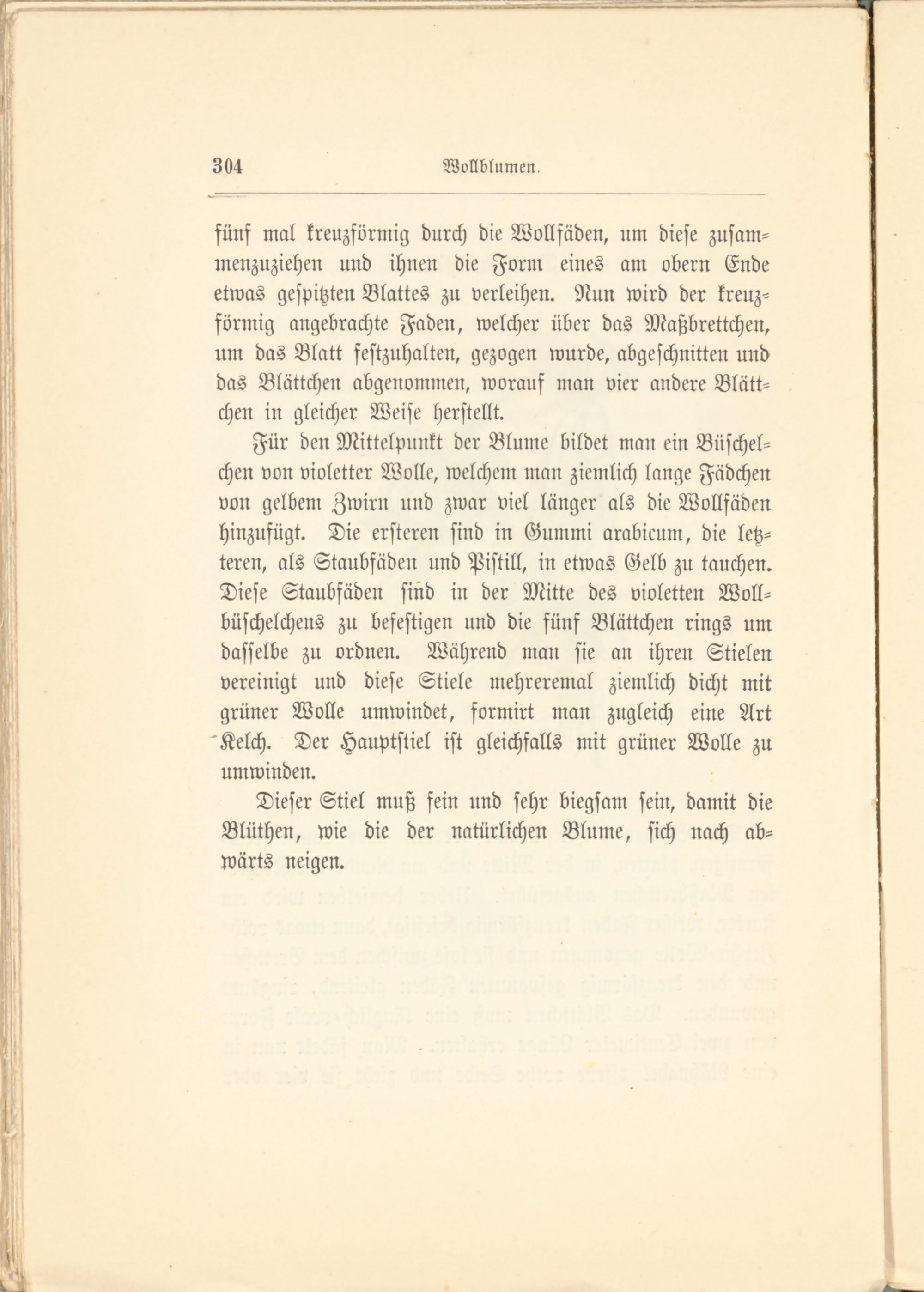 Für den Mittelpunkt der Blume bildet man ein Büschel- chen von violetter Wolle, welchem man ziemlich lange Fädchen von gelbem Zwirn und zwar viel länger als die Wollfäden hinzufügt. Die ersteren sind in Gummi arabicum, die letzteren, als Staubfäden und Pistill, in etwas Gelb zu tauchen. Diese Staubfäden sind in der Mitte des violetten Woll- büschelchens zu befestigen und die fünf Blättchen rings um dasselbe zu ordnen. Während man sie an ihren Stielen vereinigt und diese Stiele mehreremal ziemlich dicht mit grüner Wolle umwindet, formirt man zugleich eine Art 'Kelch. Der Hauptstiel ist gleichfalls mit grüner Wolle zu umwinden.