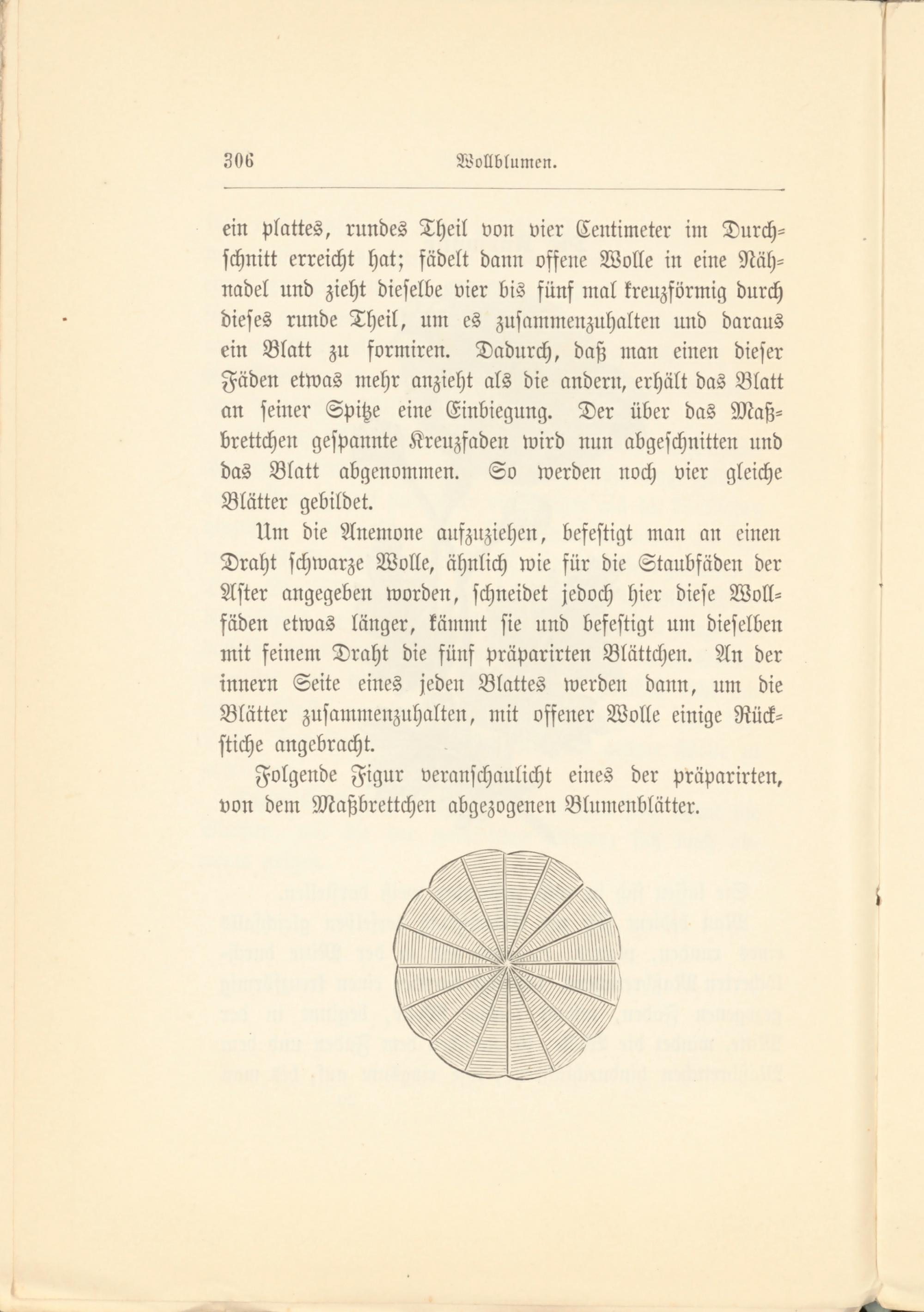 Um die Anemone aufzuziehen, befestigt man an einen Draht schwarze Wolle, ähnlich wie für die Staubfäden der Aster angegeben worden, schneidet jedoch hier diese Woll- fäden etwas länger, kämmt sie und befestigt um dieselben mit feinem Draht die fünf präparirten Blättchen. An der innern Seite eines jeden Blattes werden dann, um die Blätter zusammenzuhalten, mit offener Wolle einige Rück- stiche angebracht.
