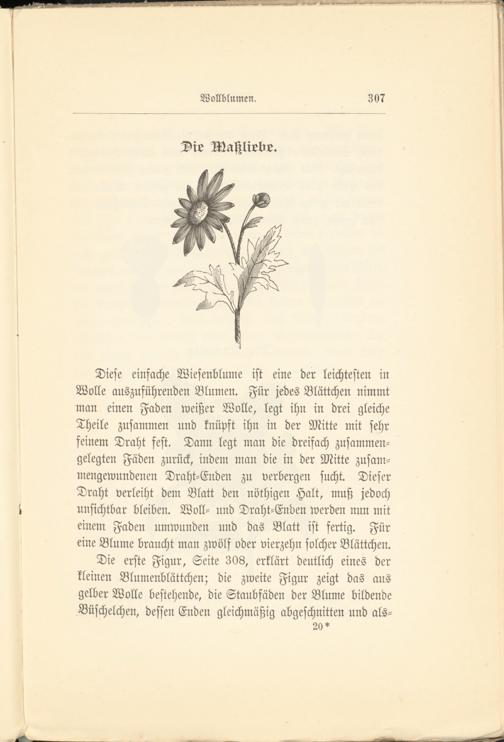 Diese einfache Wiesenblume ist eine der leichtesten in Wolle auszuführenden Blumen. Für jedes Blättchen nimmt man einen Faden weißer Wolle, legt ihn in drei gleiche Theile zusammen und knüpft ihn in der Mitte mit sehr seinem Draht fest. Dann legt man die dreifach zusammengelegten Fäden zurück, indem man die in der Mitte znsam- mengewundenen Draht-Enden zu verbergen sucht. Dieser Draht verleiht dem Blatt den nöthigen Halt, muß jedoch unsichtbar bleiben. Woll- und Draht-Enden werden nun mit einem Faden umwunden und das Blatt ist fertig. Für eine Blume braucht man zwölf oder vierzehn solcher Blättchen.