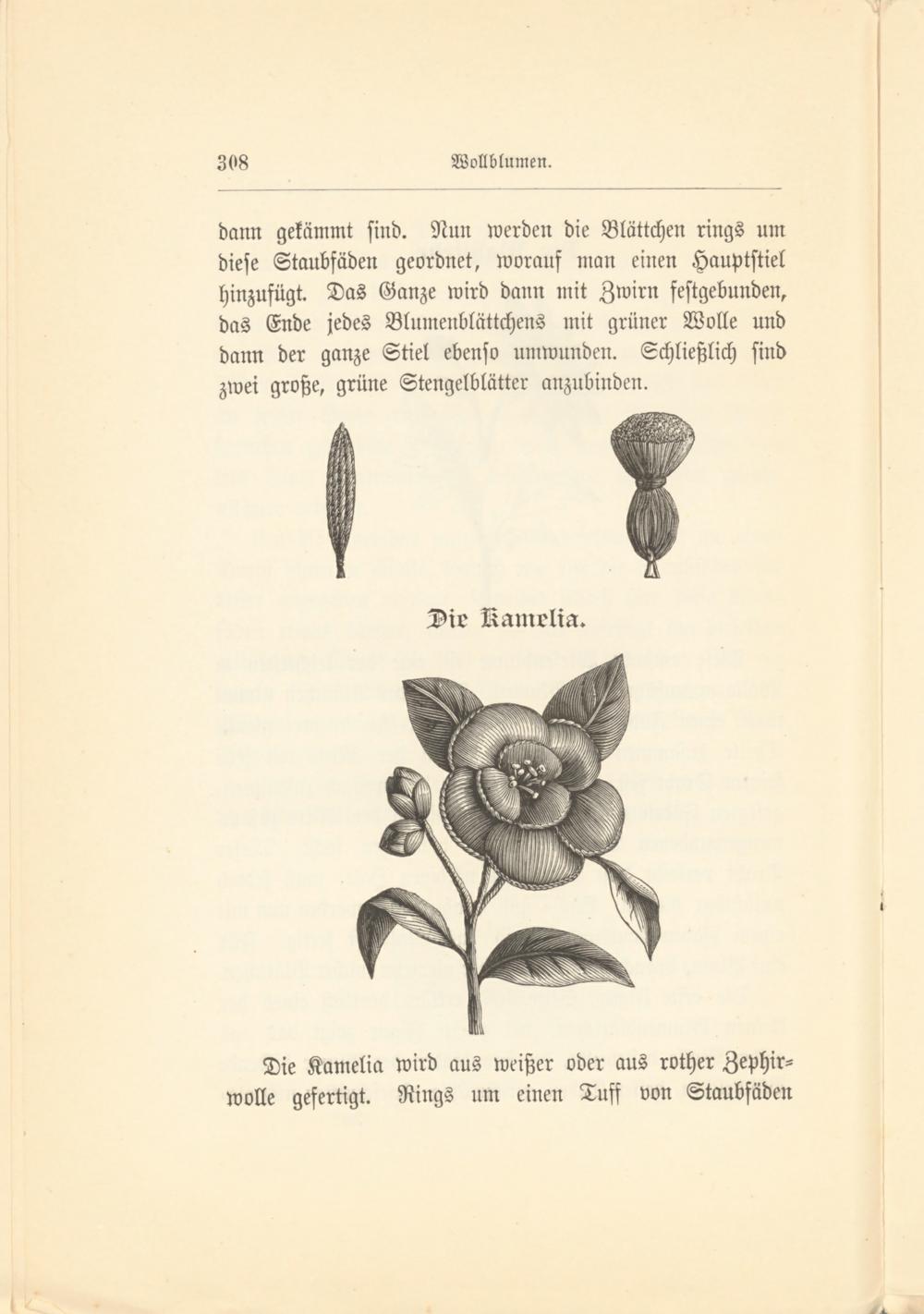 Die Kamelia wird aus weißer oder aus rother Zephirwolle gefertigt. Rings um einen Tuff von Staubfäden