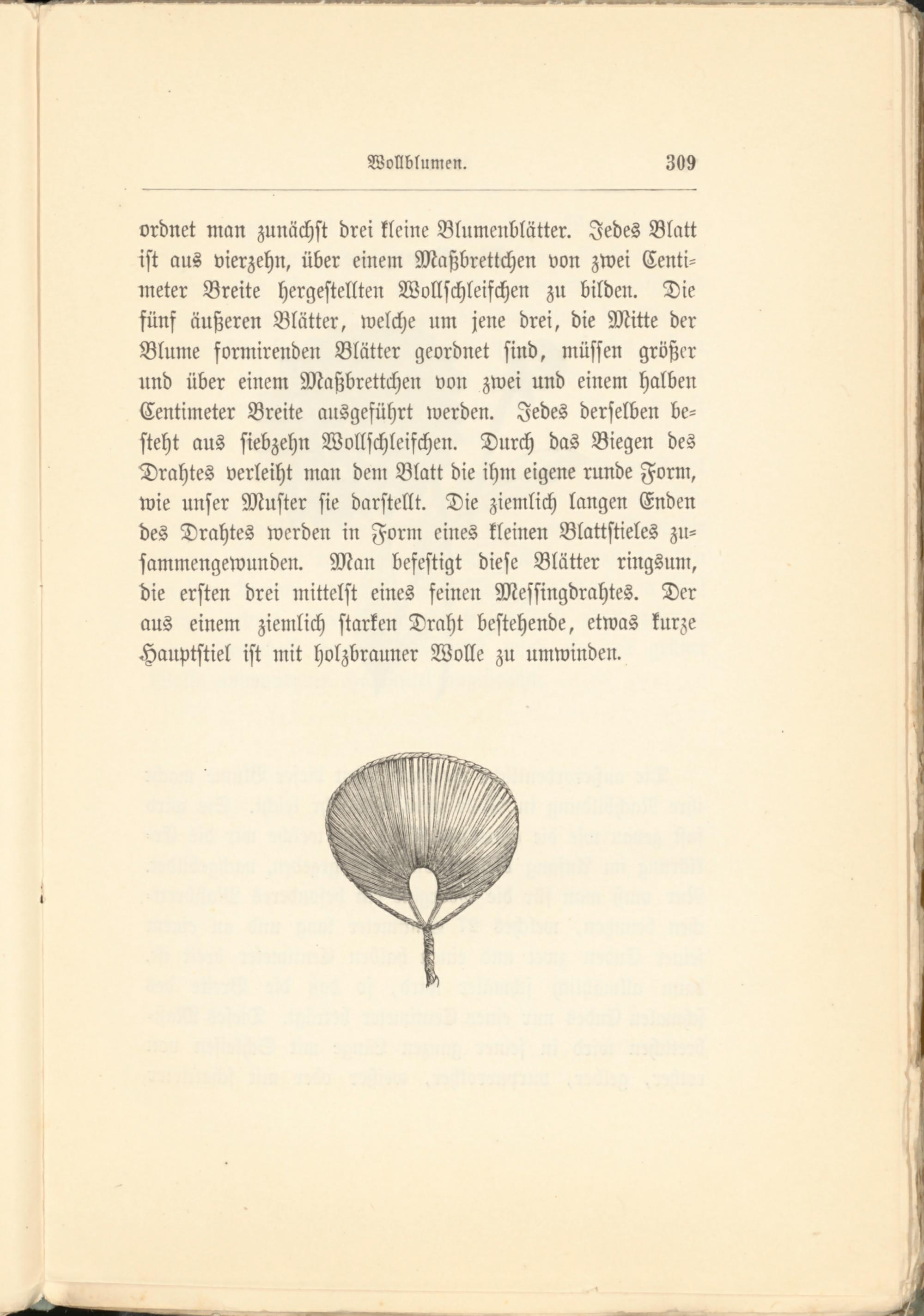 ordnet man zunächst drei kleine Blumenblätter. Jedes Blatt ist aus vierzehn, über einem Maßbrettchen von zwei Centi- meter Breite hergestellten Wollschleifchen zu bilden. Die fünf äußeren Blätter, welche um jene drei, die Mitte der Blume formirenden Blätter geordnet sind, müssen größer und über einem Maßbrettchen von zwei und einem halben Centiineter Breite ausgeführt werden. Jedes derselben besteht aus siebzehn Wollschleifchen. Durch das Biegen des Drahtes verleiht man dem Blatt die ihm eigene runde Form, wie unser Muster sie darstellt. Die ziemlich langen Enden des Drahtes werden in Form eines kleinen Blattstieles zu- sammengewunden. Man befestigt diese Blätter ringsum, die ersten drei mittelst eines feinen Messingdrahtes. Der aus einem ziemlich starken Draht bestehende, etwas kurze Hauptstiel ist mit Holzbrauner Wolle zu umwinden.