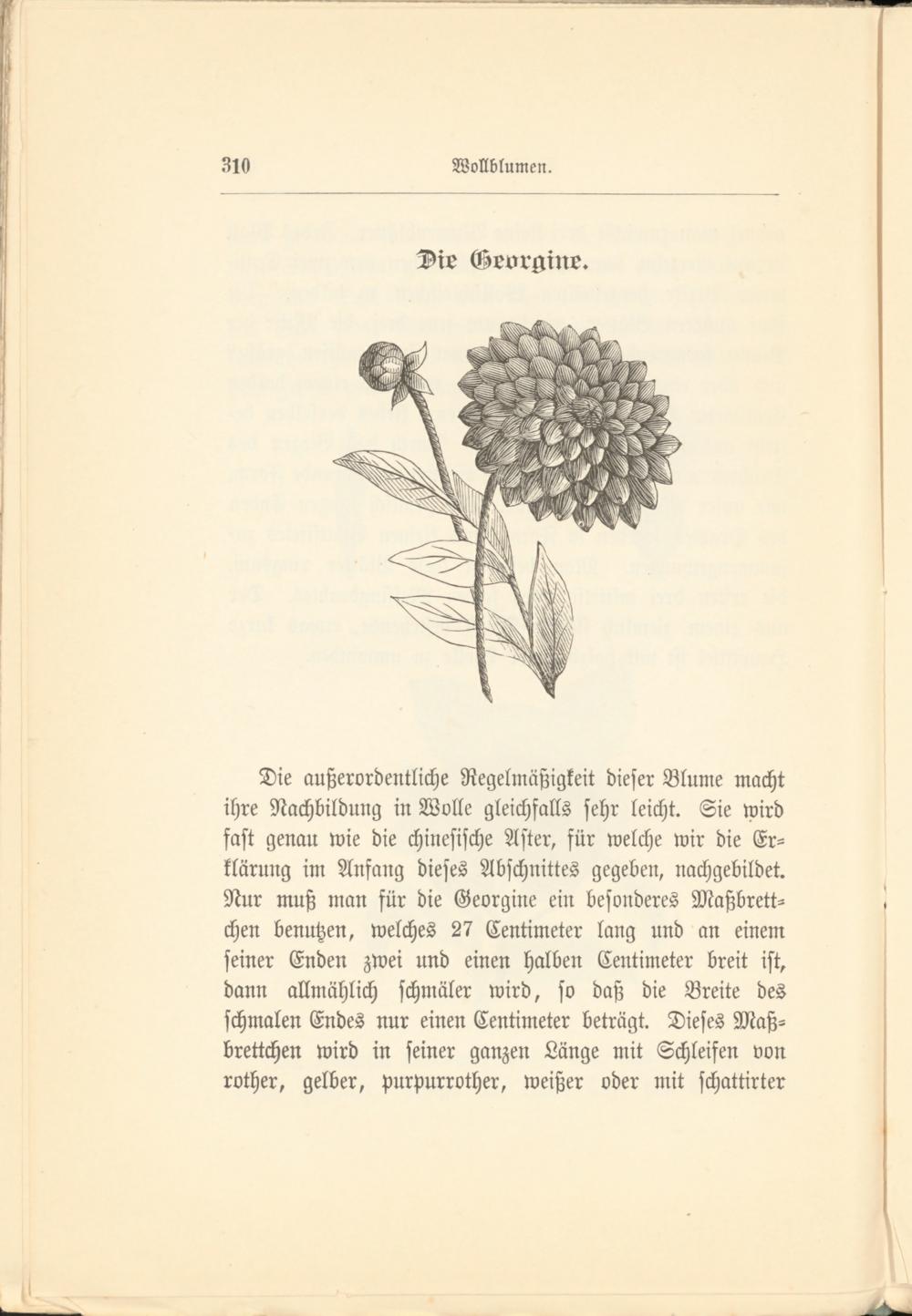 Die außerordentliche Regelmäßigkeit dieser Blume macht ihre Nachbildung in Wolle gleichfalls sehr leicht. Sie wird fast genau wie die chinesische Aster, für welche wir die Erklärung im Anfang dieses Abschnittes gegeben, nachgebildet. Nur muß man für die Georgine ein besonderes Maßbrett- chen benutzen, welches 27 Centimeter lang und an einem seiner Enden zwei und einen halben Centimeter breit ist, dann allmählich schmäler wird, so daß die Breite des schmalen Endes nur einen Centimeter beträgt. Dieses Maß- brettchen wird in seiner ganzen Länge mit Schleifen von rother, gelber, purpurrother, weißer oder mit schattirter