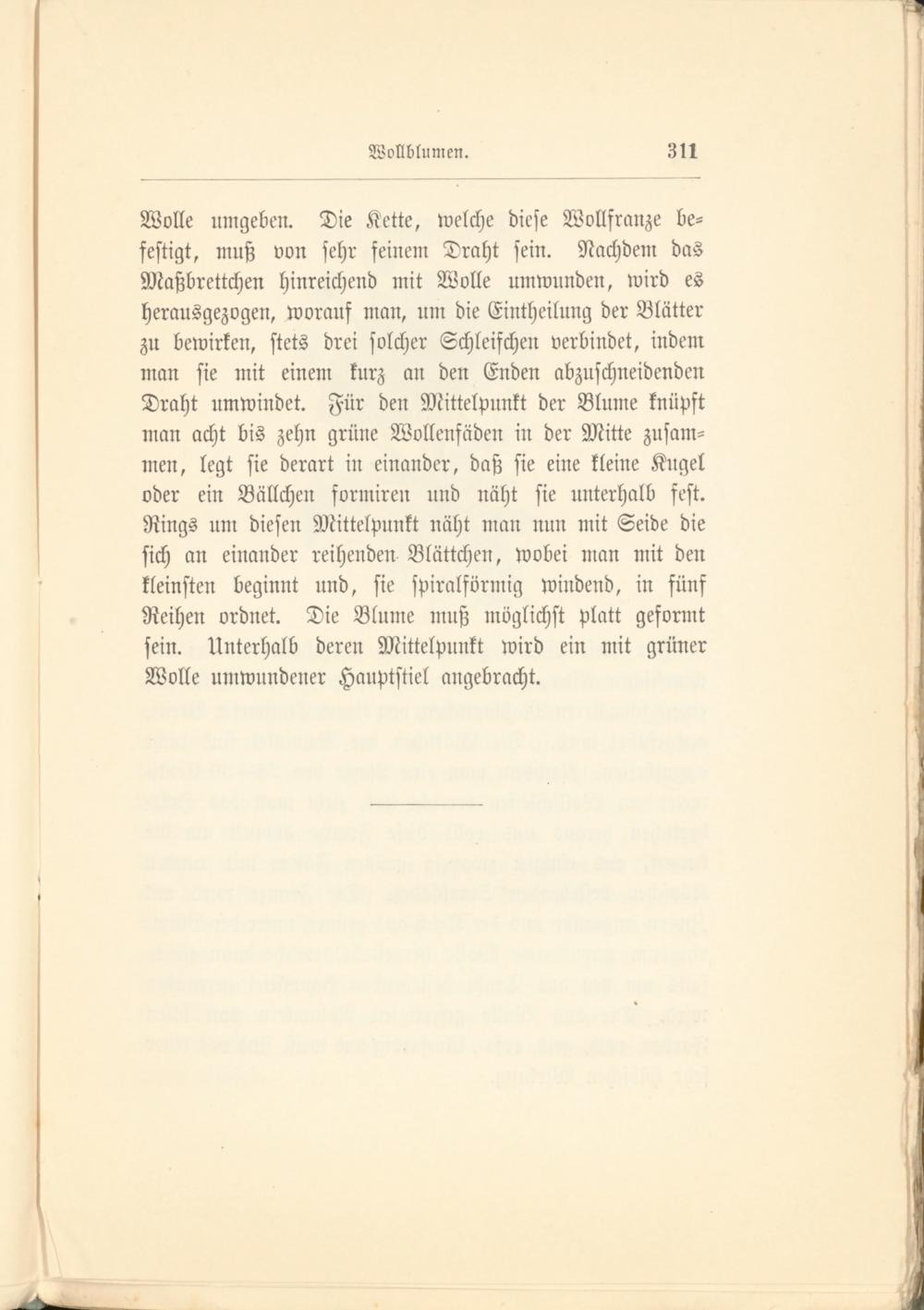 Wolle umgeben. Die Kette, welche diese Wollfranze befestigt, muß von sehr feinem Draht sein. Nachdem das Maßbrettchen hinreichend mit Wolle umwunden, wird es herausgezogen, worauf man, um die Einteilung der Blätter zu bewirken, stets drei solcher Schleifchen verbindet, indem man sie mit einem kurz an den Enden abzuschneidenden Draht umwindet. Für den Mittelpunkt der Blume knüpft man acht bis zehn grüne Wollenfäden in der Mitte zusammen, legt sie derart in einander, daß sie eine kleine Kugel oder ein Bällchen formiren und näht sie unterhalb fest. Rings um diesen Mittelpunkt näht man nun mit Seide die sich an einander reihenden Blättchen, wobei man mit den kleinsten beginnt und, sie spiralförmig windend, in fünf Reihen ordnet. Die Blume muß möglichst platt geformt sein. Unterhalb deren Mittelpunkt wird ein mit grüner Wolle umwundener Hauptstiel angebracht.