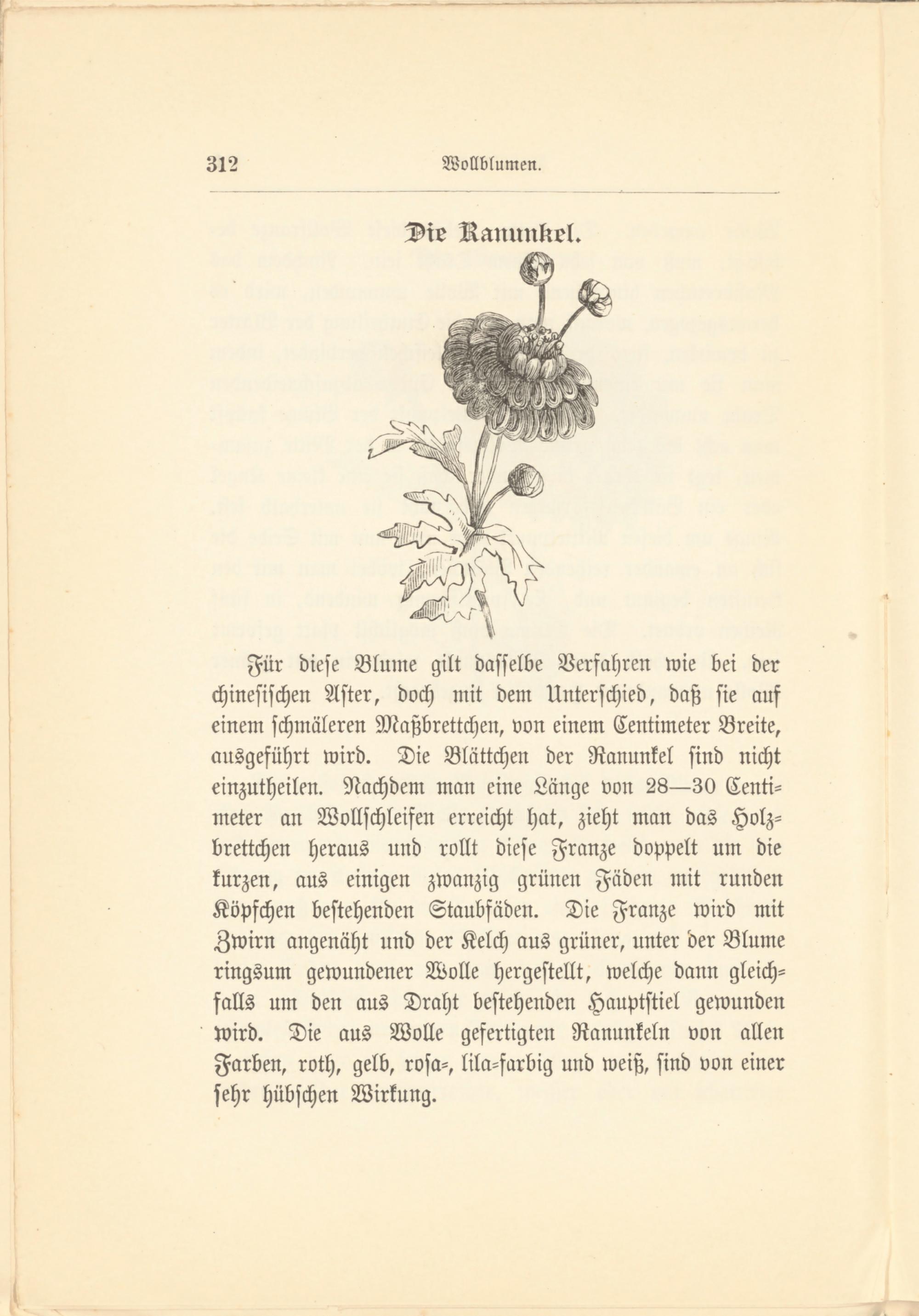 Für diese Blume gilt dasselbe Verfahren wie bei der chinesischen Aster, doch mit dem Unterschied, daß sie auf einem schmäleren Maßbrettchen, von einem Centimeter Breite, ausgeführt wird. Die Blättchen der Ranunkel sind nicht einzutheilen. Nachdem man eine Länge von 28—30 Centimeter an Wollschleifen erreicht hat, zieht man das Holz- brettchen heraus und rollt diese Franze doppelt um die kurzen, aus einigen zwanzig grünen Fäden mit runden Köpfchen bestehenden Staubfäden. Die Franze wird mit Zwirn angenäht und der Kelch aus grüner, unter der Blume ringsum gewundener Wolle hergestellt, welche dann gleichfalls um den aus Draht bestehenden Hauptstiel gewunden wird. Die aus Wolle gefertigten Ranunkeln von allen Farben, roth, gelb, rosa-, lila-farbig und weiß, sind von einer sehr hübschen Wirkung.