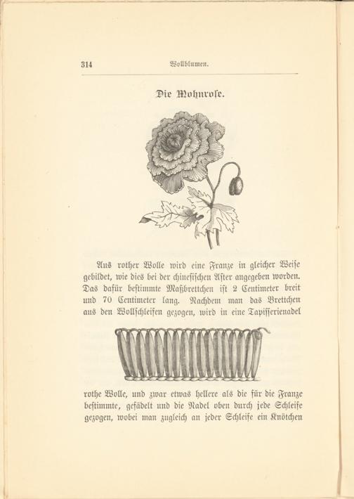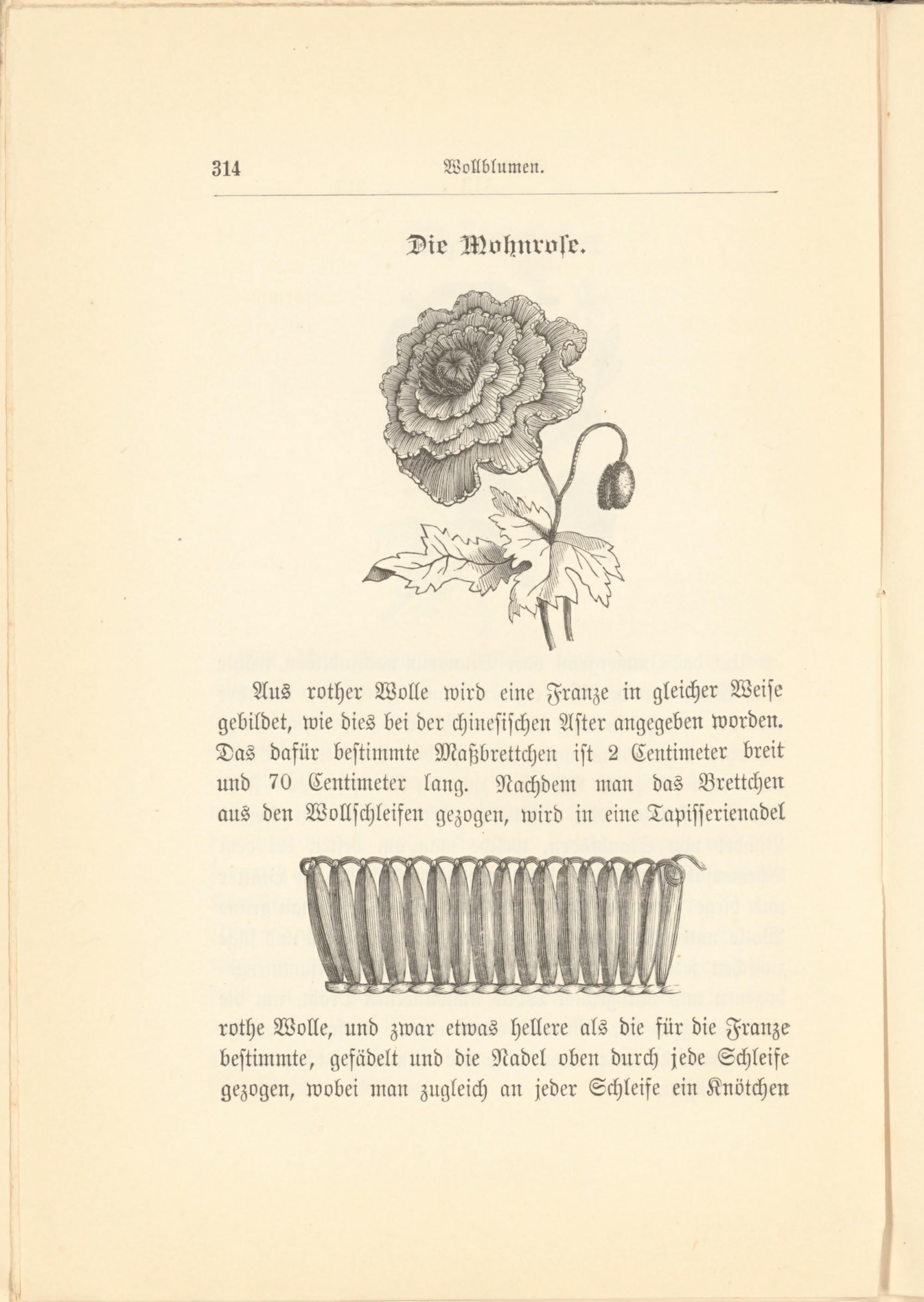 Aus rother Wolle wird eine Franze in gleicher Weise gebildet, wie dies bei der chinesischen Aster angegeben worden. Das dafür bestimmte Maßbrettchen ist 2 Centimeter breit und 70 Centimeter lang. Nachdem man das Brettchen aus den Wollschleifen gezogen, wird in eine Tapisserienadel