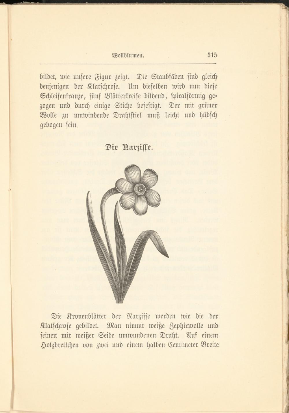 Die Kronenblätter der Narzisse werden wie die der Klatschrose gebildet. Man nimmt weiße Zephirwolle und feinen mit weißer Seide umwundenen Draht. Auf einem Holzbrettchen von zwei und einem halben Centimeter Breite