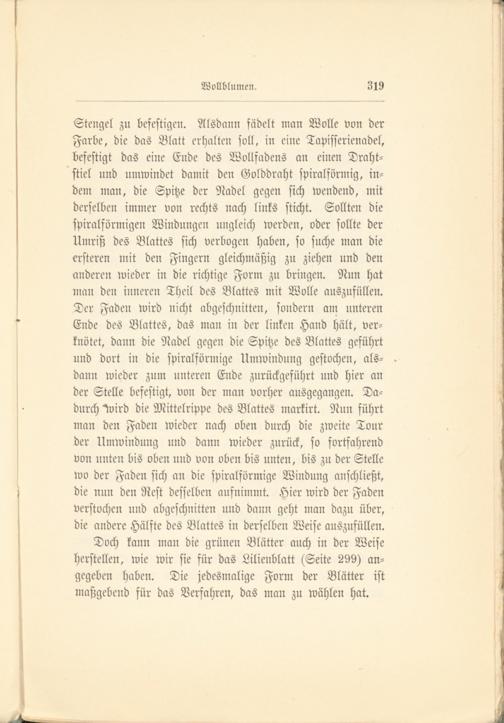 Stengel zu befestigen. Alsdann fädelt man Wolle von der Farbe, die das Blatt erhalten soll, in eine Tapisserienadel, befestigt das eine Ende des Wollfadens an einen Drahtstiel und umwindet damit den Golddraht spiralförmig, indem man, die Spitze der Nadel gegen sich wendend, mit derselben immer von rechts nach links sticht. Sollten die spiralförmigen Windungen ungleich werden, oder sollte der Umriß des Blattes sich verbogen haben, so suche man die ersteren mit den Fingern gleichmäßig zu ziehen und den anderen wieder in die richtige Form zu bringen. Nun hat man den inneren Theil des Blattes mit Wolle auszufüllen. Der Faden wird nicht abgeschnitten, sondern am unteren Ende des Blattes, das man in der linken Hand hält, ver- knötet, dann die Nadel gegen die Spitze des Blattes geführt und dort in die spiralförmige Umwindnng gestochen, alsdann wieder znm unteren Ende zurückgeführt und hier an der Stelle befestigt, von der man vorher ausgegangen. Dadurch "wird die Mittelrippe des Blattes markirt. Nun führt man den Faden wieder nach oben durch die zweite Tour der Umwindnng und dann wieder zurück, so fortfahrend von unten bis oben und von oben bis unten, bis zu der Stelle wo der Faden sich an die spiralförmige Windung anschließt, die nun den Rest desselben aufnimmt. Hier wird der Faden verstochen und abgeschnitten und dann geht man dazu über, die andere Hälfte des Blattes in derselben Weise auszufüllen.
