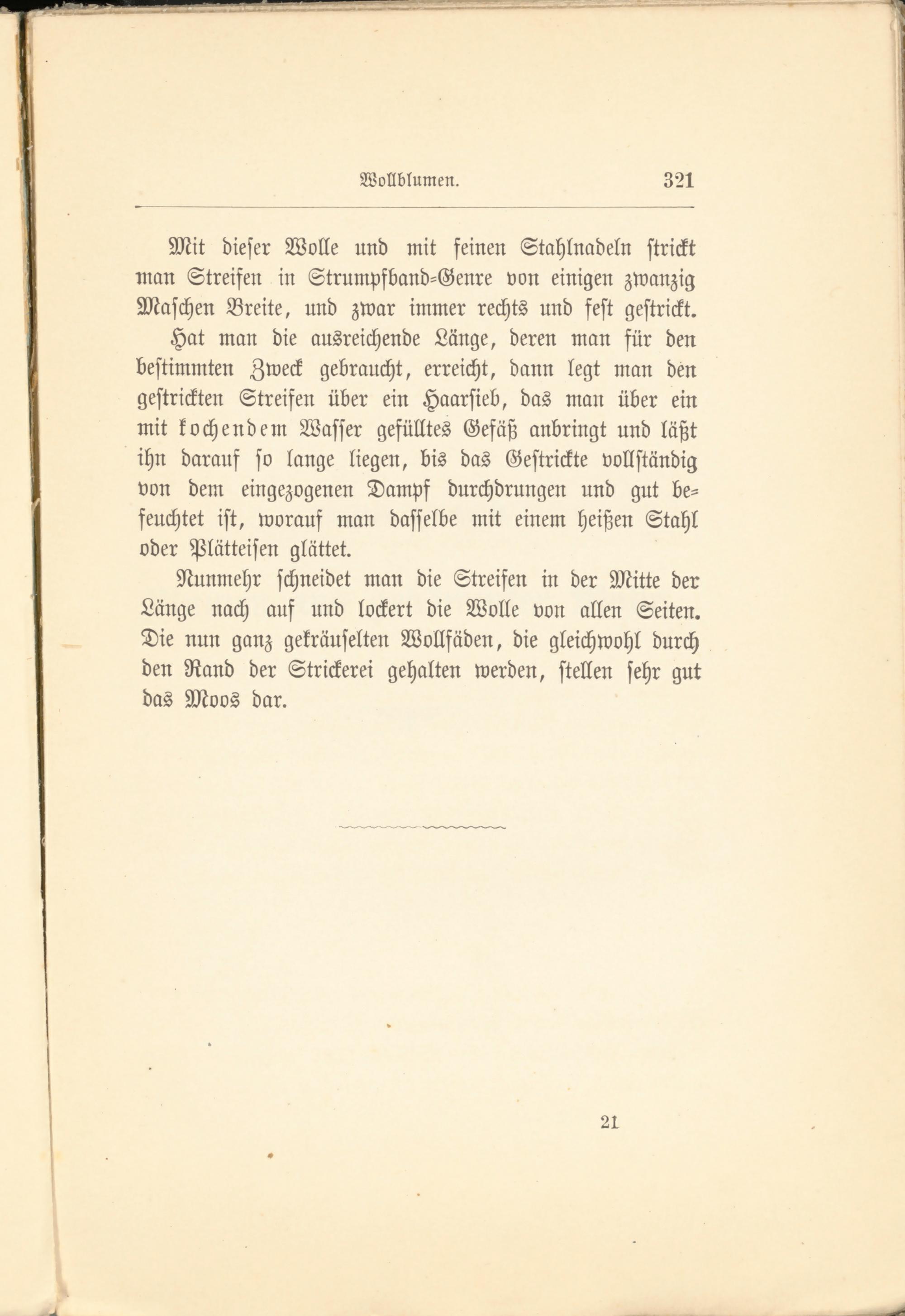 Nunmehr schneidet man die Streifen in der Mitte der Länge nach auf und lockert die Wolle von allen Seiten. Die nun ganz gekräuselten Wollfäden, die gleichwohl durch den Rand der Strickerei gehalten werden, stellen sehr gut das Moos dar.