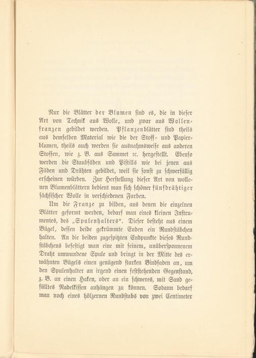 Nur die Blätter der Blumen sind es, die in dieser Art von Technik aus Wolle, und zwar aus Wollen- franzen gebildet werden. Pflanzenblätter sind theils aus demselben Material wie die der Stoff- und Papierblumen, theils auch werden sie ausnahmsweise aus anderen Stoffen, wie z. B. aus Sammet rc. hergestellt. Ebenso werden die Staubfäden und Pistills wie bei jenen aus Fäden und Drähten gebildet, weil sie sonst zu schwerfällig erscheinen würden. Zur Herstellung dieser Art von wollenen Blumenblättern bedient man sich schöner fünfdrähtiger sächsischer Wolle in verschiedenen Farben.