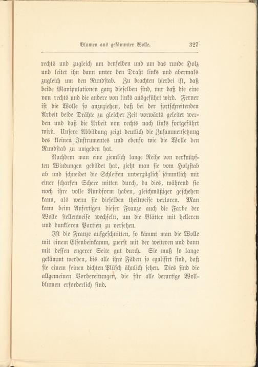 Ist die Franze aufgeschnitten, so kämmt man die Wolle mit einem Elfenbeinkamm, zuerst mit der weiteren und dann mit dessen engerer Seite gut durch. Sie muß so lange gekämmt werden, bis alle ihre Fäden so egalisirt sind, daß sie einem feinen dichten Plüsch ähnlich sehen. Dies sind die allgemeinen Vorbereitungen, die für alle derartige Woll- blumen erforderlich sind.