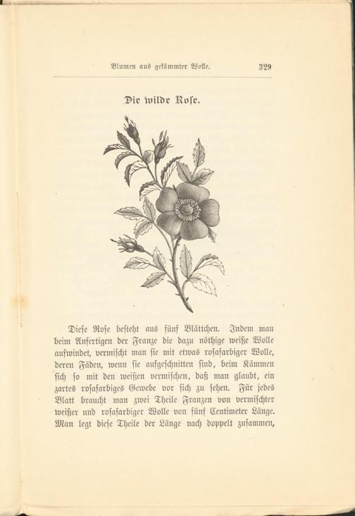 Diese Rose besteht aus sünf Blättchen. Indem man beim Anfertigen der Franze die dazu nöthige weiße Wolle aufwindet, vermischt man sie mit etwas rosafarbiger Wolle, deren Fäden, wenn sie aufgeschnitten sind, beim Kämmen sich so mit den weißen vermischen, daß man glaubt, ein Zartes rosafarbiges Gewebe vor sich zu sehen. Für jedes Blatt braucht man zwei Theile Franzen von vermischter weißer und rosafarbiger Wolle von fünf Cenümeter Länge. Man legt diese Theile der Länge nach doppelt zusammen.