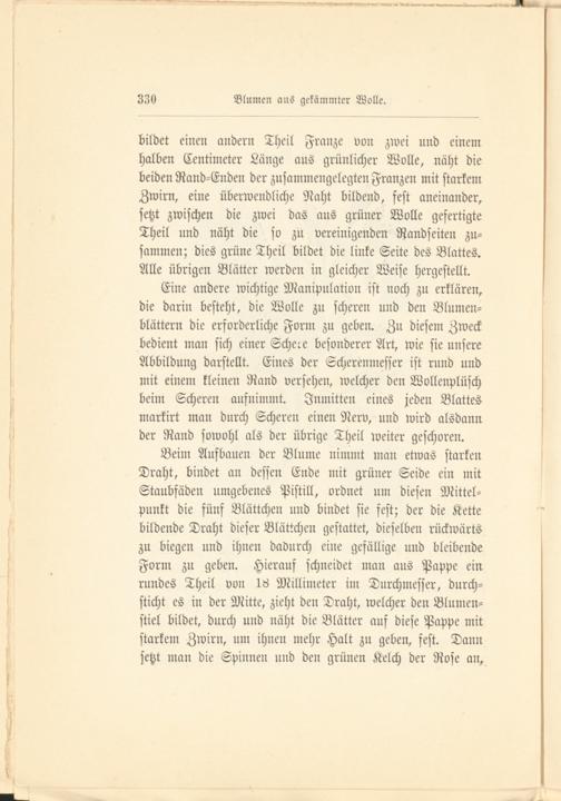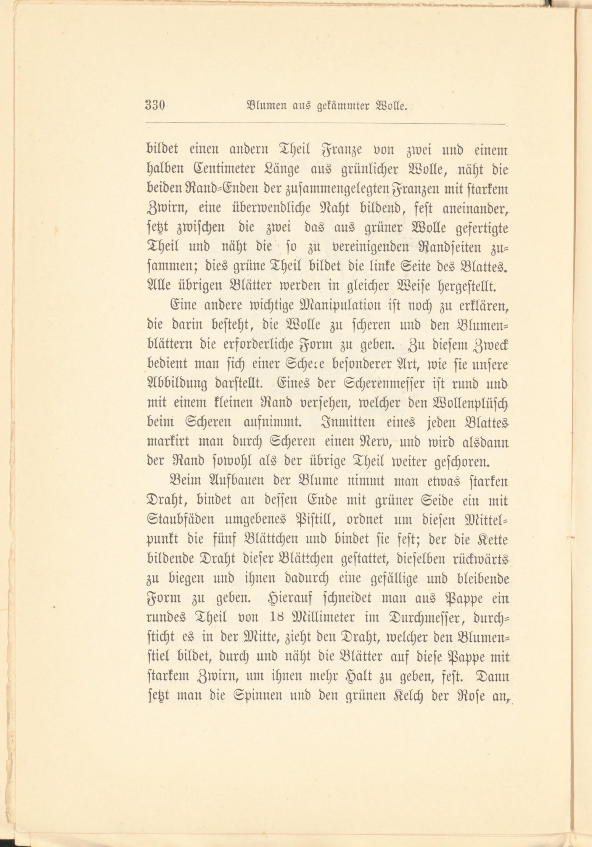 Eine andere wichtige Manipulation ist noch zu erklären, die darin besteht, die Wolle zu scheren und den Blumenblättern die erforderliche Form zu geben. Zu diesem Zweck bedient man sich einer Schere besonderer Art, wie sie unsere Abbildung darstellt. Eines der Scherenmesser ist rund und mit einem kleinen Rand versehen, welcher den Wollenplüsch beim Scheren aufnimmt. Inmitten eines jeden Blattes markirt man durch Scheren einen Nerv, und wird alsdann der Rand sowohl als der übrige Theil weiter geschoren.