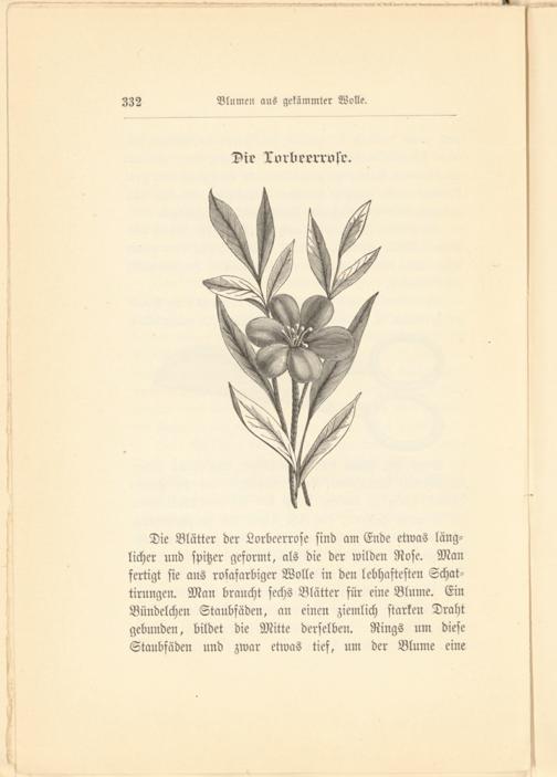 Die Blätter der Lorbeerrose sind am Ende etwas länglicher und spitzer geformt, als die der wilden Rose. Man fertigt sie aus rosafarbiger Wolle in den lebhaftesten Schat- tirungen. Man braucht sechs Blätter für eine Blume. Ein Bnndelchen Staubfäden, an einen ziemlich starken Draht gebunden, bildet die Mitte derselben. Rings um diese Staubfäden und zwar etwas tief, um der Blume eine