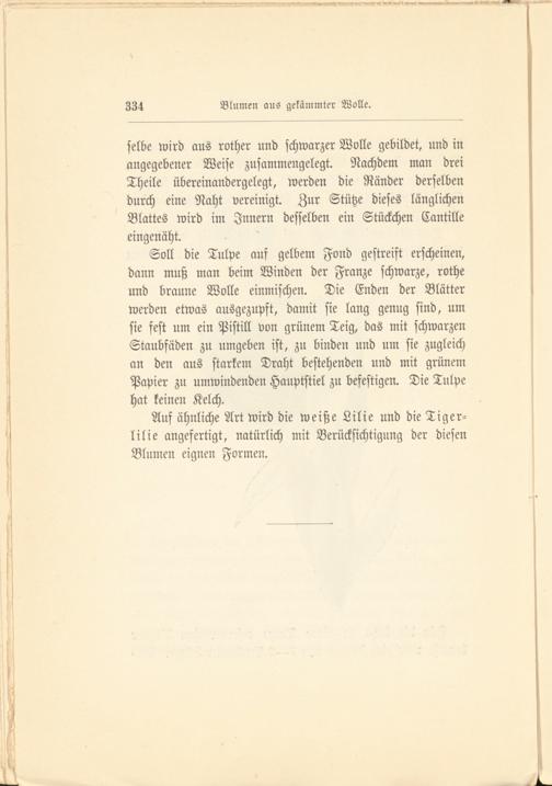 Soll die Tulpe auf gelbem Fond gestreift erscheinen, dann muß man beim Winden der Franze schwarze, rothe und braune Wolle einmischen. Die Enden der Blätter werden etwas ausgezupft, damit sie lang genug sind, um sie fest um ein Pistill von grünem Teig, das mit schwarzen Staubfäden zu umgeben ist, zu binden und um sie zugleich an den aus starkem Draht bestehenden und mit grünem Papier zu umwindenden Hauptstiel zu befestigen. Die Tulpe hat keinen Kelch.