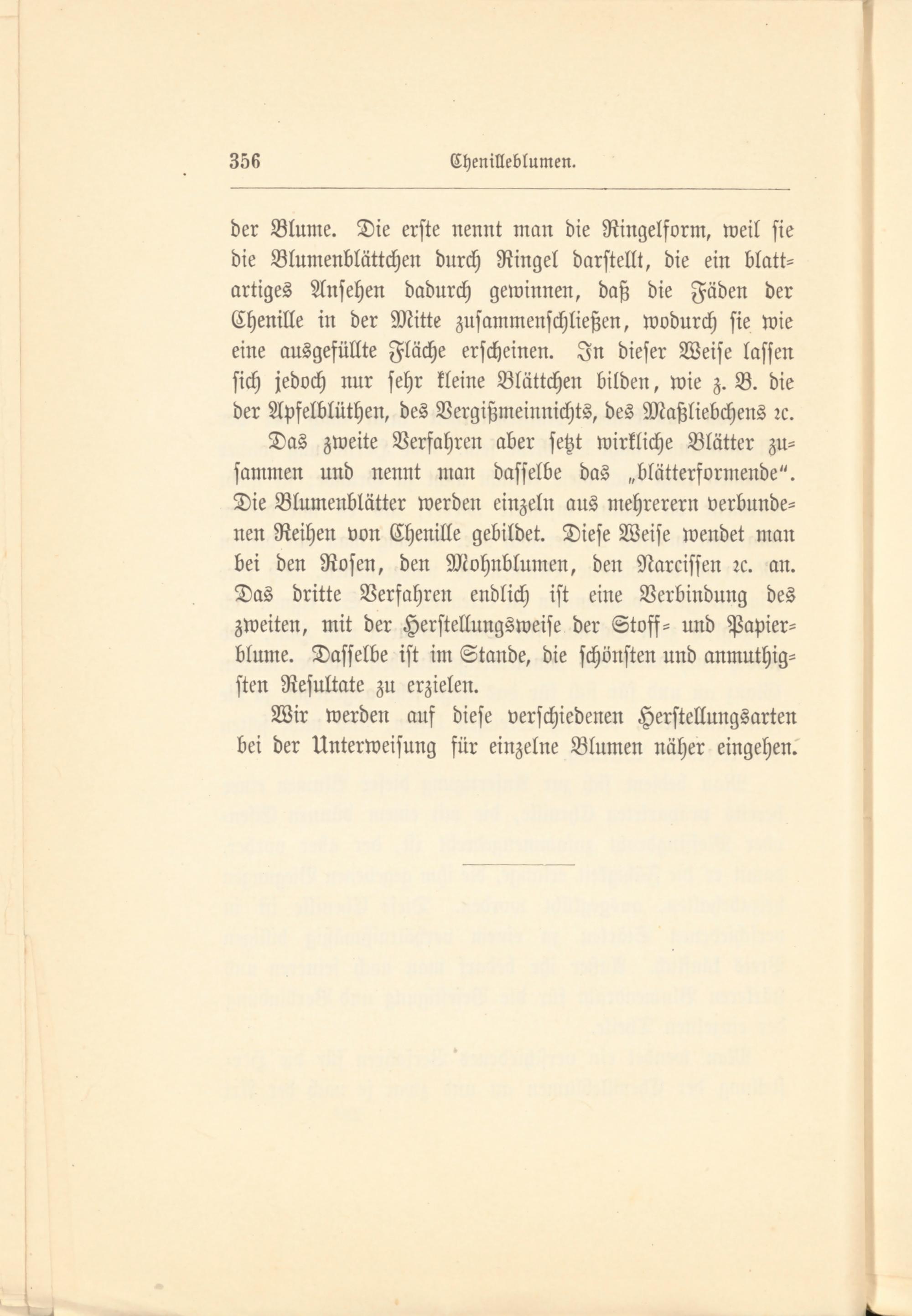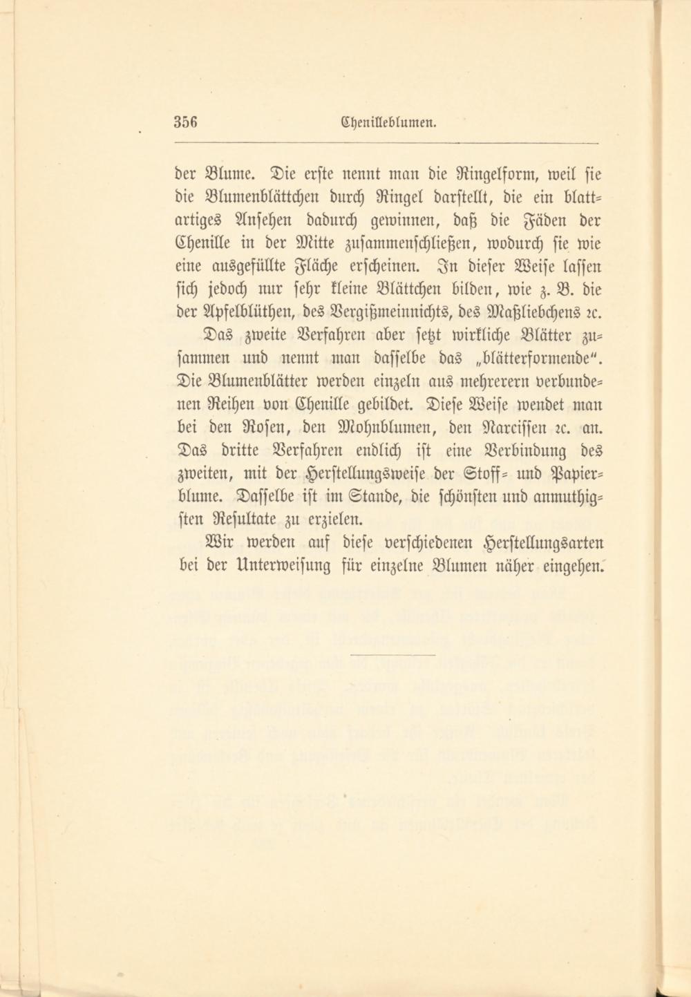 der Blume. Die erste nennt man die Ringelform, weil sie die Blnmenblättchen durch Ringel darstellt, die ein blatt- artiges Ansehen dadurch gewinnen, daß die Fäden der Chenille in der Mitte zusammenschließen, wodurch sie wie eine ausgefüllte Fläche erscheinen. In dieser Weise lassen sich jedoch nur sehr kleine Blättchen bilden, wie z. B. die der Apfelblüthen, des Vergißmeinnicht^ des Maßliebchens rc.