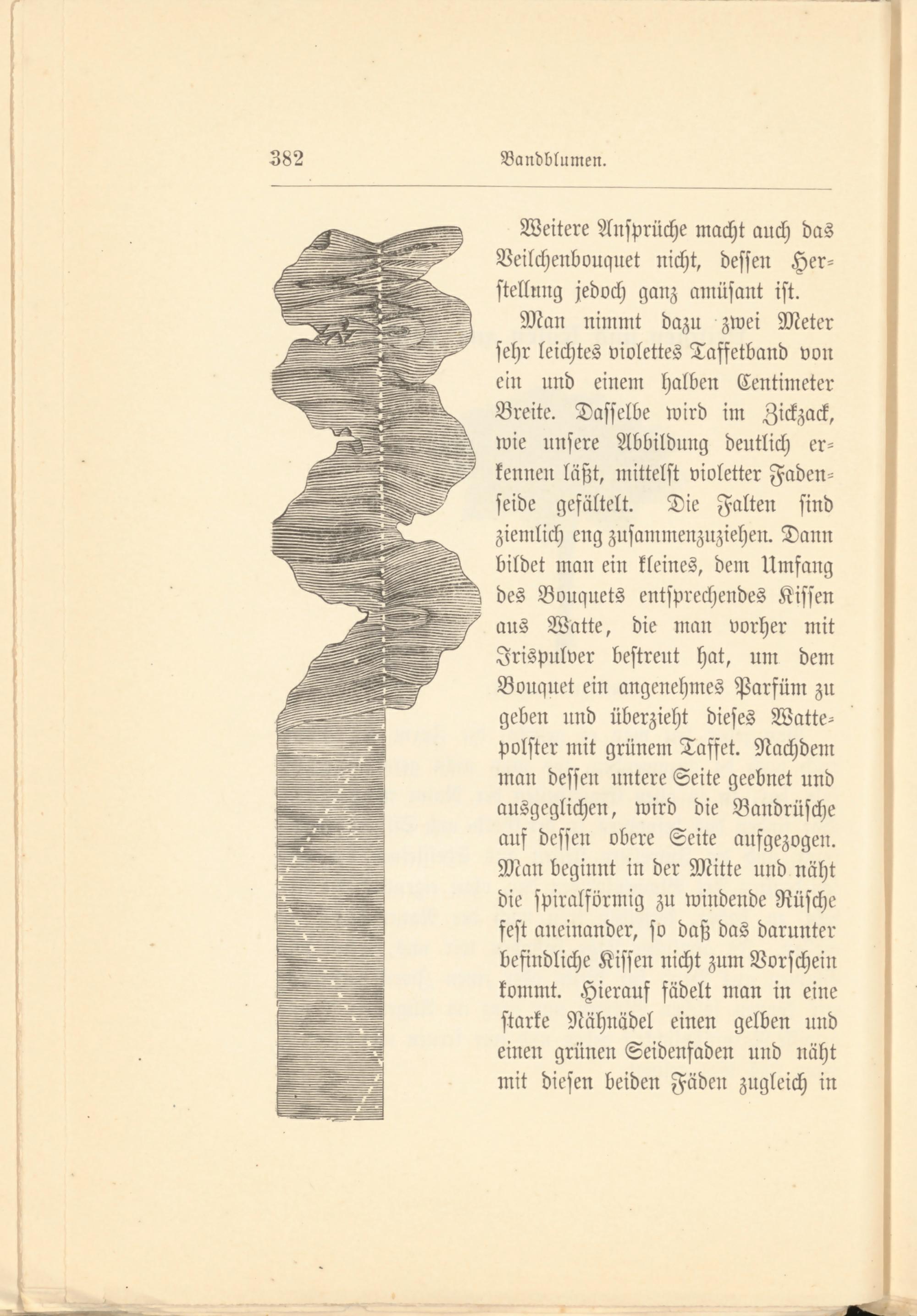 Alan nimmt dazu zwei Meter sehr leichtes violettes Tafsetband von ein und einem halben Centimeter Breite. Dasselbe wird im Zickzack, wie unsere Abbildung deutlich erkennen läßt, mittelst violetter Fadenseide gefältelt. Die Falten sind ziemlich eng zusammenzuziehen. Dann bildet man ein kleines, dem Umfang des Bouquets entsprechendes Kissen aus Watte, die man vorher mit Jrispulver bestreut hat, um dem Bouqnet ein angenehmes Parfüm zu geben und überzieht dieses Wattepolster mit grünem Tastet. Nachdem man dessen untere Seite geebnet und ausgeglichen, wird die Bandrüsche auf dessen obere Seite aufgezogen. Man beginnt in der Mitte und näht die spiralförmig zu windende Rüsche fest aneinander, so daß das darunter befindliche Kissen nicht zum Vorschein kommt. Hierauf fädelt man in eine starke Nähnadel einen gelben und einen grünen Seidenfaden und näht mit diesen beiden Fäden zugleich in