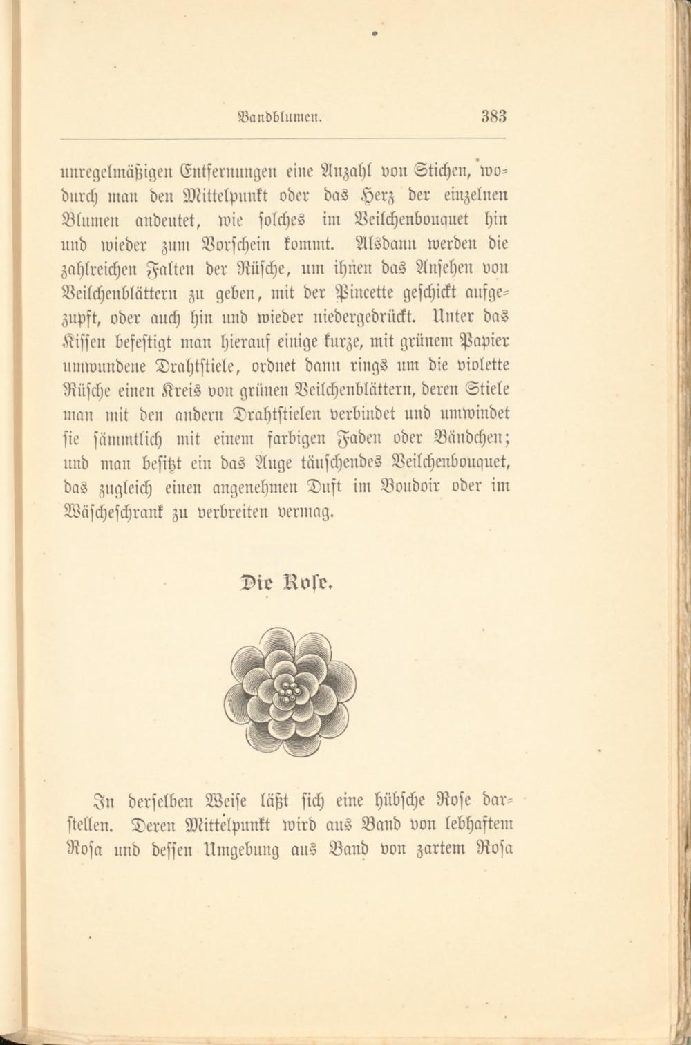 unregelmäßigen Entfernungen eine Anzahl von Stichen, wodurch man den Mittelpunkt oder das Herz der einzelnen Blumen andeutet, wie solches im Beilchenbouquet hin und wieder zum Vorschein kommt. Alsdann werden die zahlreichen Falten der Rüsche, um ihnen das Ansehen von Veilchenblättern zu geben, mit der Pincette geschickt ausgezupft, oder auch hin und wieder niedergedrückt. Unter das Kissen befestigt man hierauf einige kurze, mit grünem Papier umwundene Drahtstiele, ordnet dann rings um die violette Rüsche einen Kreis von grünen Veilchenblättern, deren Stiele man mit den andern Trahtstielen verbindet und umwindet sie sämmtlich mit einem farbigen Faden oder Bündchen; und man besitzt ein das Auge täuschendes Veilchenbouquet, das zugleich einen angenehmen Duft im Boudoir oder im Wäscheschrank zu verbreiten vermag.