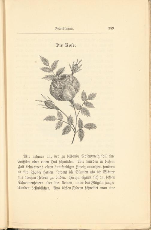 Wir nehmen an, der zu bildende Rosenzweig soll eine Coiffüre oder einen Hut schmücken. Wir würden in diesem Fall keineswegs einen buntfarbigen Zweig anrathen, sondern es für schöner halten, sowohl die Blumen als die Blätter aus weißen Federn zu bilden. Hierzu eignen sich am besten Schwanenfedern oder die kleinen, unter den Flügeln junger Tauben befindlichen. Aus diesen Federn schneidet man eine