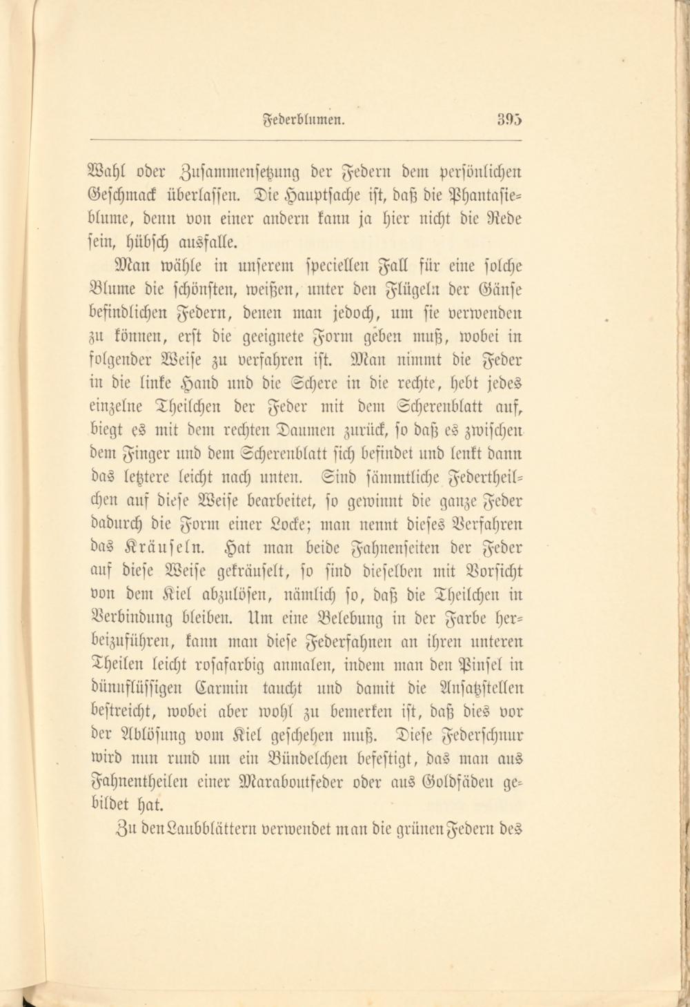 Man wähle in unserem speciellen Fall für eine solche Blume die schönsten, weißen, unter den Flügeln der Gänse befindlichen Federn, denen man jedoch, um sie verwenden zu können, erst die geeignete Form geben muß, wobei in folgender Weise zu verfahren ist. Man nimmt die Feder in die linke Hand und die Schere in die rechte, hebt jedes einzelne Theilchen der Feder mit dem Scherenblatt anst biegt es mit dem rechten Daumen zurück, so daß es zwischen dem Finger und dem Scherenblatt sich befindet und lenkt dann das letztere leicht nach unten. Sind sämmtliche Federtheil- chen auf diese Weise bearbeitet, so gewinnt die ganze Feder dadurch die Form einer Locke; man nennt dieses Verfahren das Kräuseln. Hat man beide Fahnenseiten der Feder auf diese Weise gekräuselt, so sind dieselben mit Vorsicht von dem Kiel abzulösen, nämlich so, daß die Theilchen in Verbindung bleiben. Um eine Belebung in der Farbe herbeizuführen, kann man diese Federfahnen an ihren unteren Theilen leicht rosafarbig anmalen, indem man den Pinsel in dünnflüssigen Carmin taucht und damit die Ansatzstellen bestreicht, wobei aber wohl zu bemerken ist, daß dies vor der Ablösung vom Kiel geschehen muß. Diese Federschnur wird nun rund um ein Bündelchen befestigt, das man aus Fahnentheilen einer Maraboutfeder oder aus Goldfäden gebildet hat.