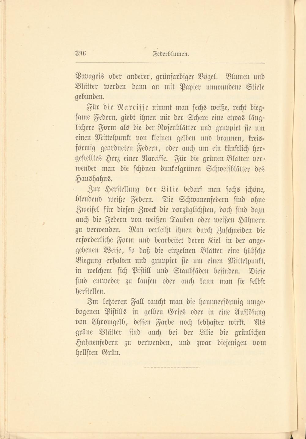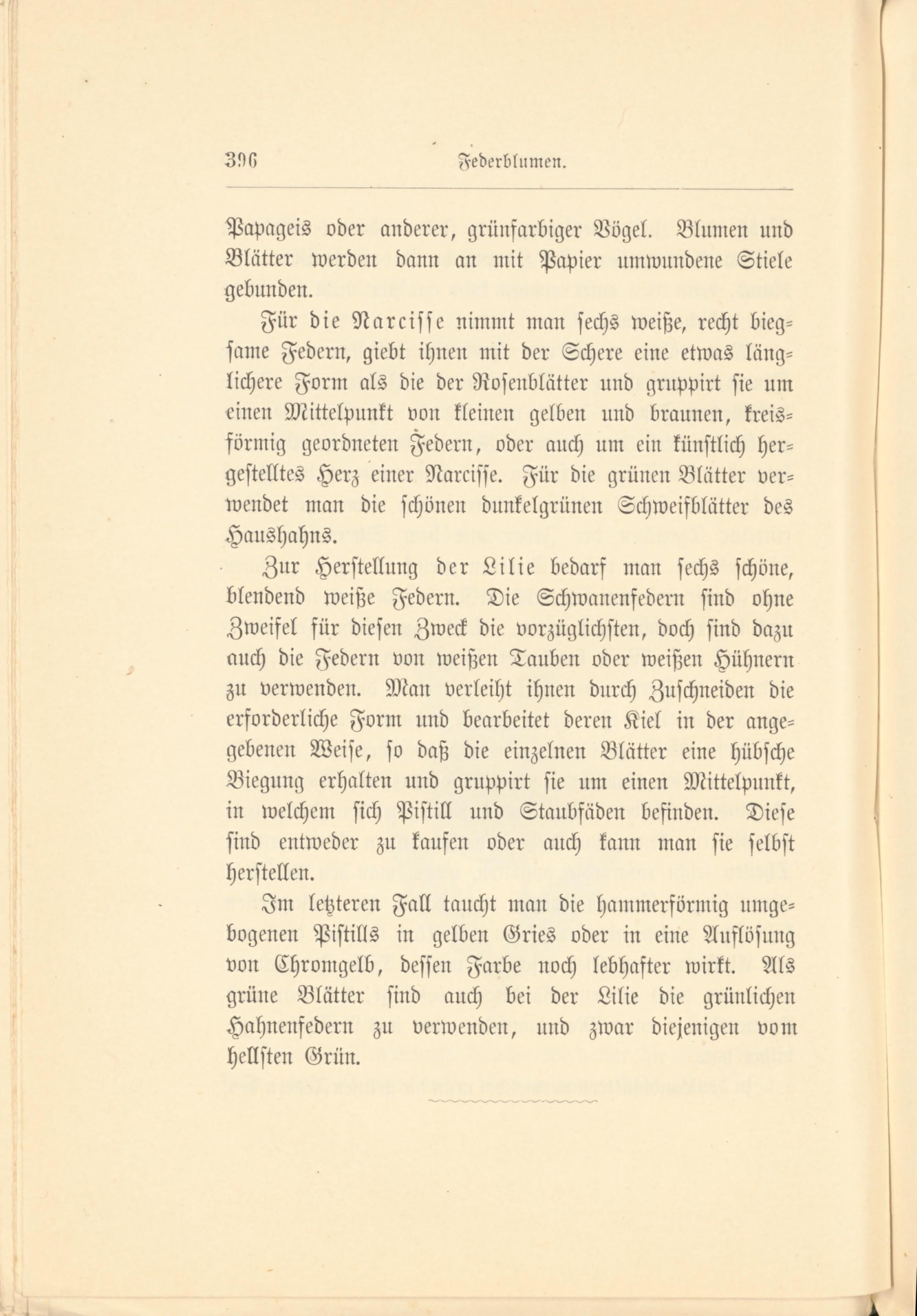 Für die Narcisse nimmt man sechs weiße, recht bieg­same Federn, giebt ihnen mit der Schere eine etwas läng­lichere Form als die der Rosenblätter und gruppirt sie um einen Mittelpunkt von kleinen gelben und braunen, kreis­förmig geordneten Federn, oder auch um ein künstlich her­gestelltes Herz einer Narcisse. Für die grünen Blätter ver­wendet man die schönen dunkelgrünen Schweifblätter des Haushahns.